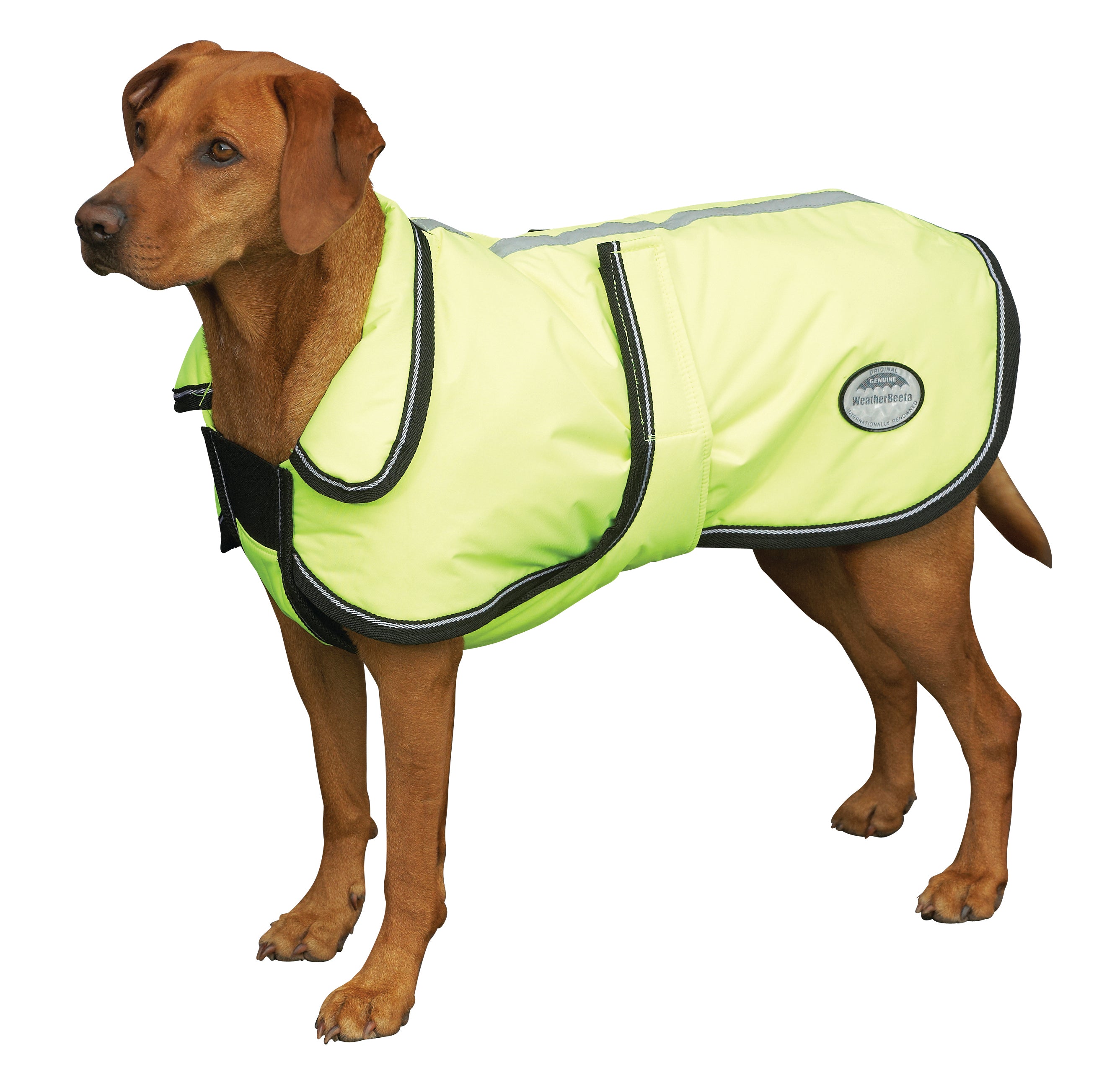 WeatherBeeta® Reflective Parka 300D Deluxe Dog Coat protects your dog with a waterproof outer and 220 grams of cozy poly fill insulation. Full wrap chest and belly closure. Large collar for extra protection. Highly visible color and reflective strips for increased visibility.