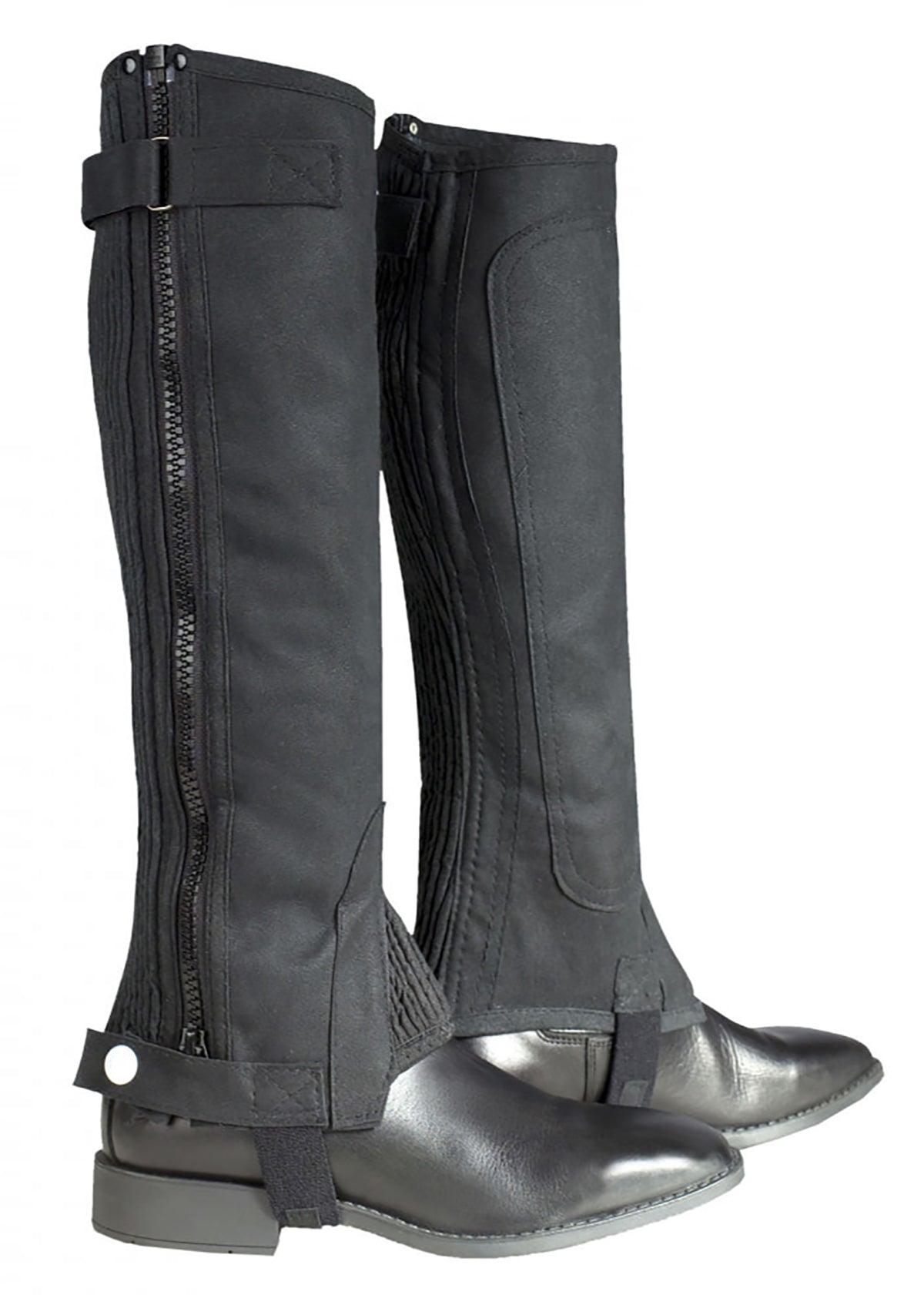Top features an adjustable hook-and-loop fastener for a custom feel, while a bottom strap overlaps the locked zipper for safety, snapping tightly in place. Designed with the rider's comfort in mind, the inner panels prevent rubbing and provide superior grip even in wet conditions. Lightweight yet strong and tear-resistant, these half chaps are perfect for active young riders. The durable high grade natural leather-like synthetic Amara fabric is heat-resistant, acid-resistant and alkali-resistant.