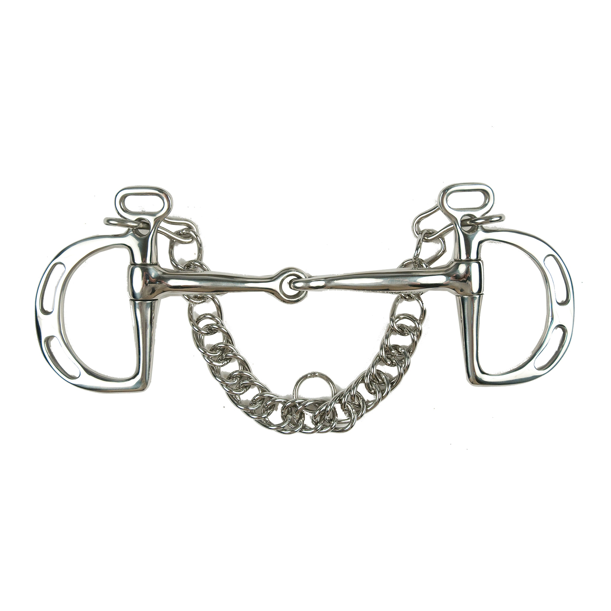 The Metalab Slotted Kimberwick Bit is a Level 2 bit in stainless steel. Mouthpiece is a 5" snaffle. Cheeks are 2 1/2". Curb chain is included.