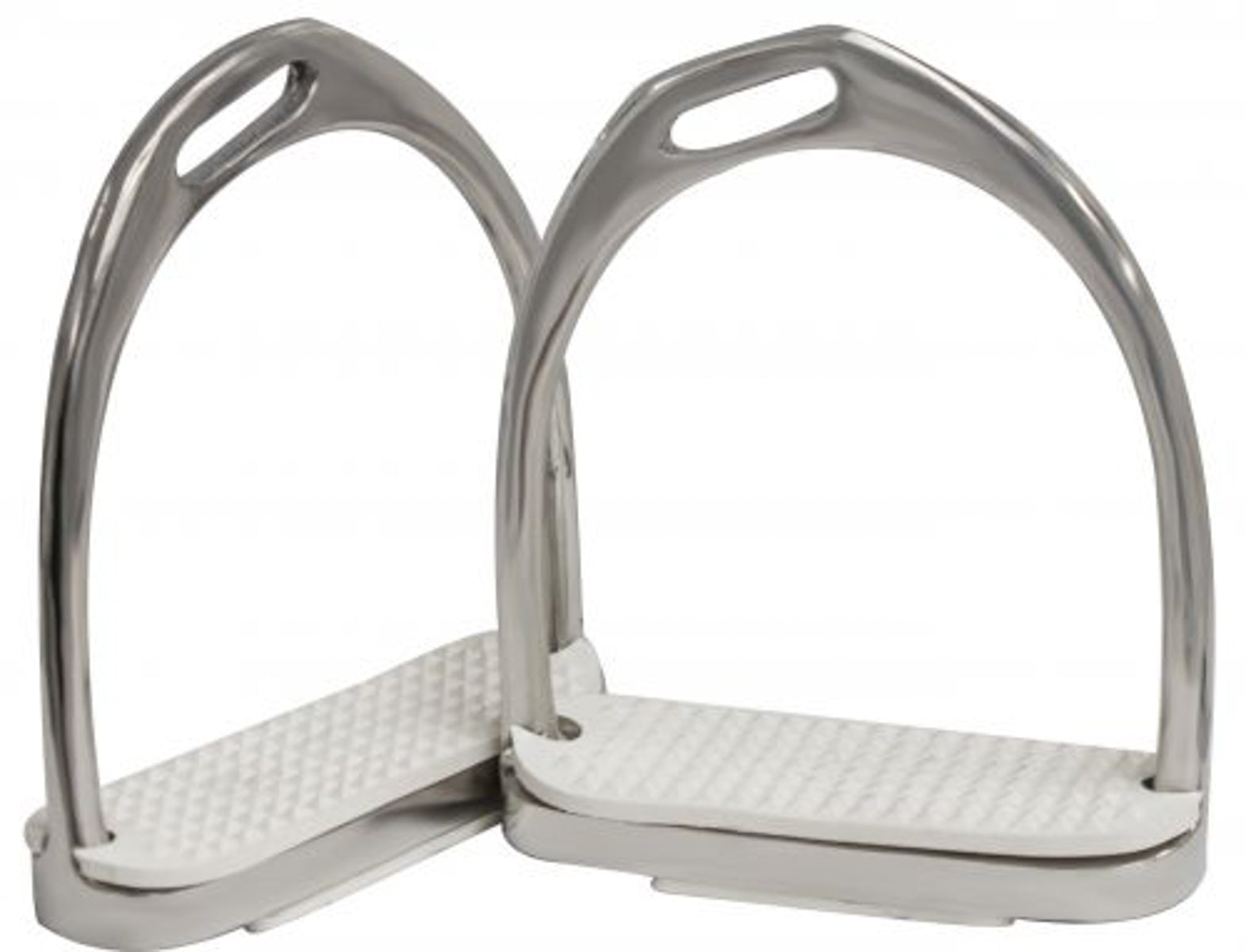 Showman® 4 3/4" Stainless Steel Offset English Irons promote rider comfort by placing the stirrup leather eyelet slightly off center.