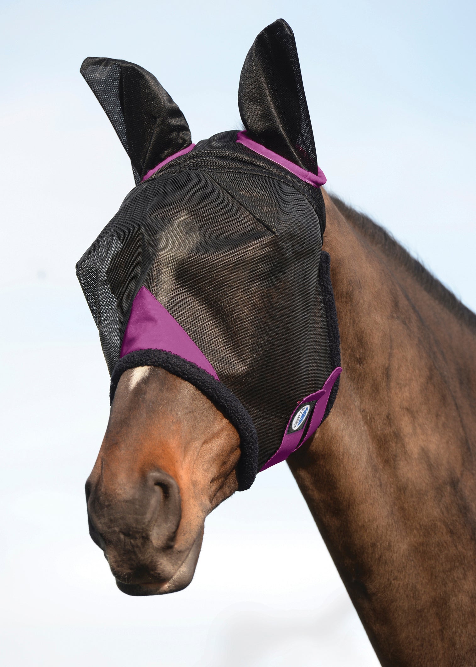 Air stream ear coves allow cooling ventilation as they keep flies out. Stretch fleece at the poll and soft fleece bindings offer added comfort. Adjustable, double-touch tape tabs allow ease of use and a secure fit.