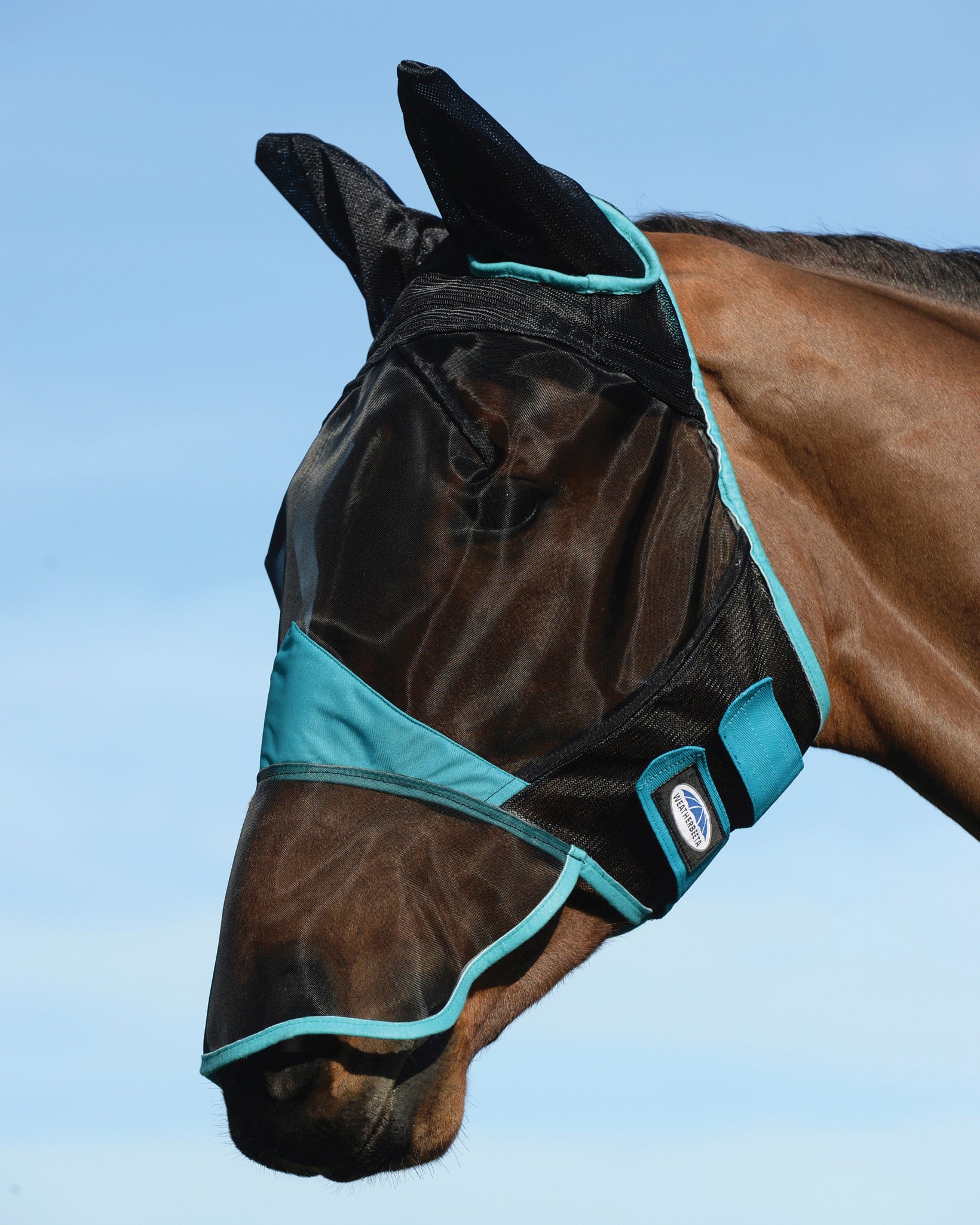 The WeatherBeeta® ComFiTec™ Fine Mesh Mask with Ears & Nose allows full vision while blocking 60%+ of ultraviolet rays. The fine mesh keeps even small insects out, and the air stream ear covers block flies while allowing ventilation. The extended nose piece is perfect for shielding light-haired muzzles.