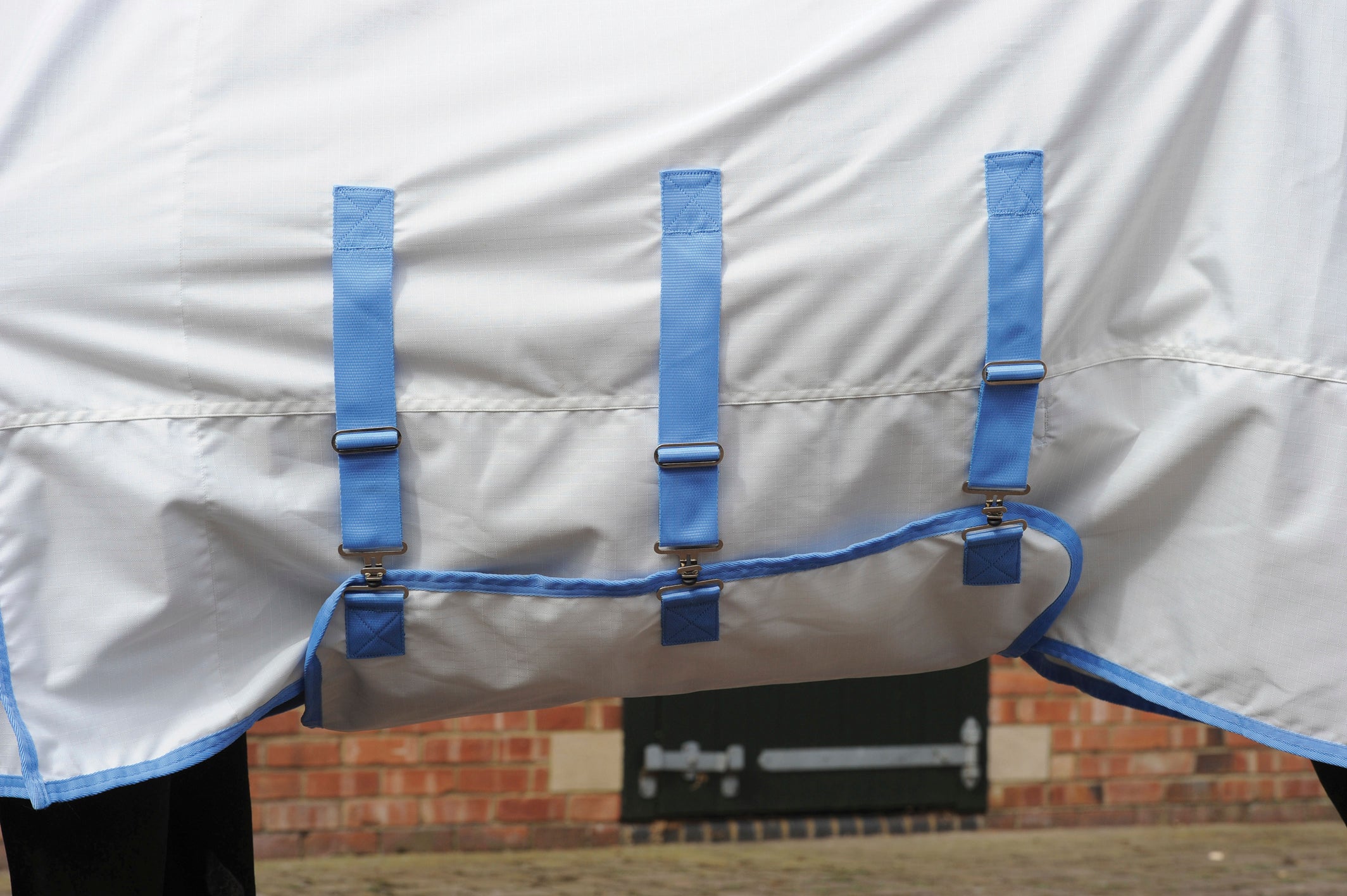 Made with a strong 600 denier ripstop outer that is highly breathable, it has lined shoulders to help prevent rubbing and stretching. An elasticized, adjustable belly wrap and full wrap tail flap ensure maximum coverage. An ear hood on the integrated neck cover has an elastic insert around the ears to ensure the neck area of the blanket stays in place to provide complete protection and boost comfort. Comfortable wither relief reduces rubbing, and traditional side gussets allow natural movement.