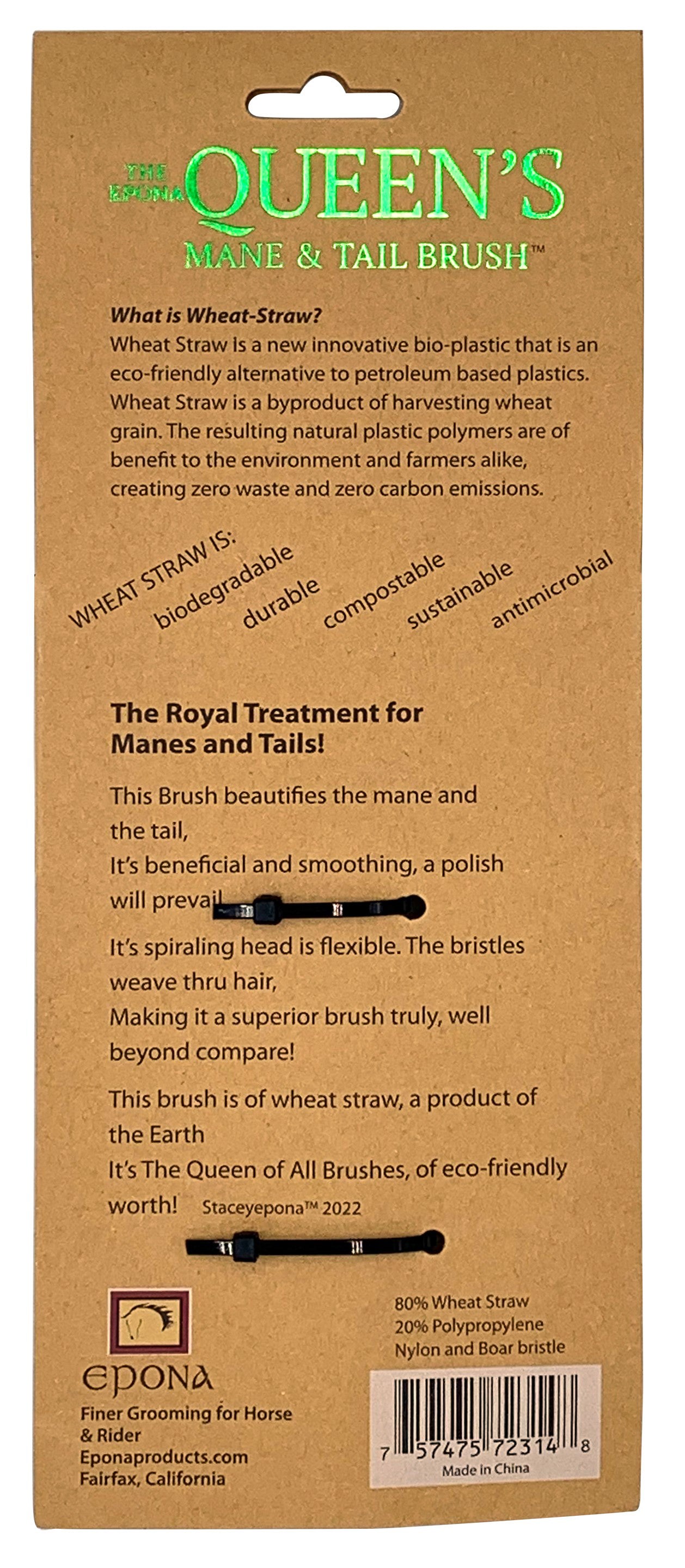 The Queen’s Mane & Tail Brush is a flexible, spiral, paddle design with boar hair and nylon bristles. The flexibility lets it gently detangle your horse’s long hair without yanking, and the bristles smoothe the hair. The back is made of an eco-friendly, extra-durable bioplastic. This lightweight brush is the “The Queen of Brushes.” Color is Wheatstraw.