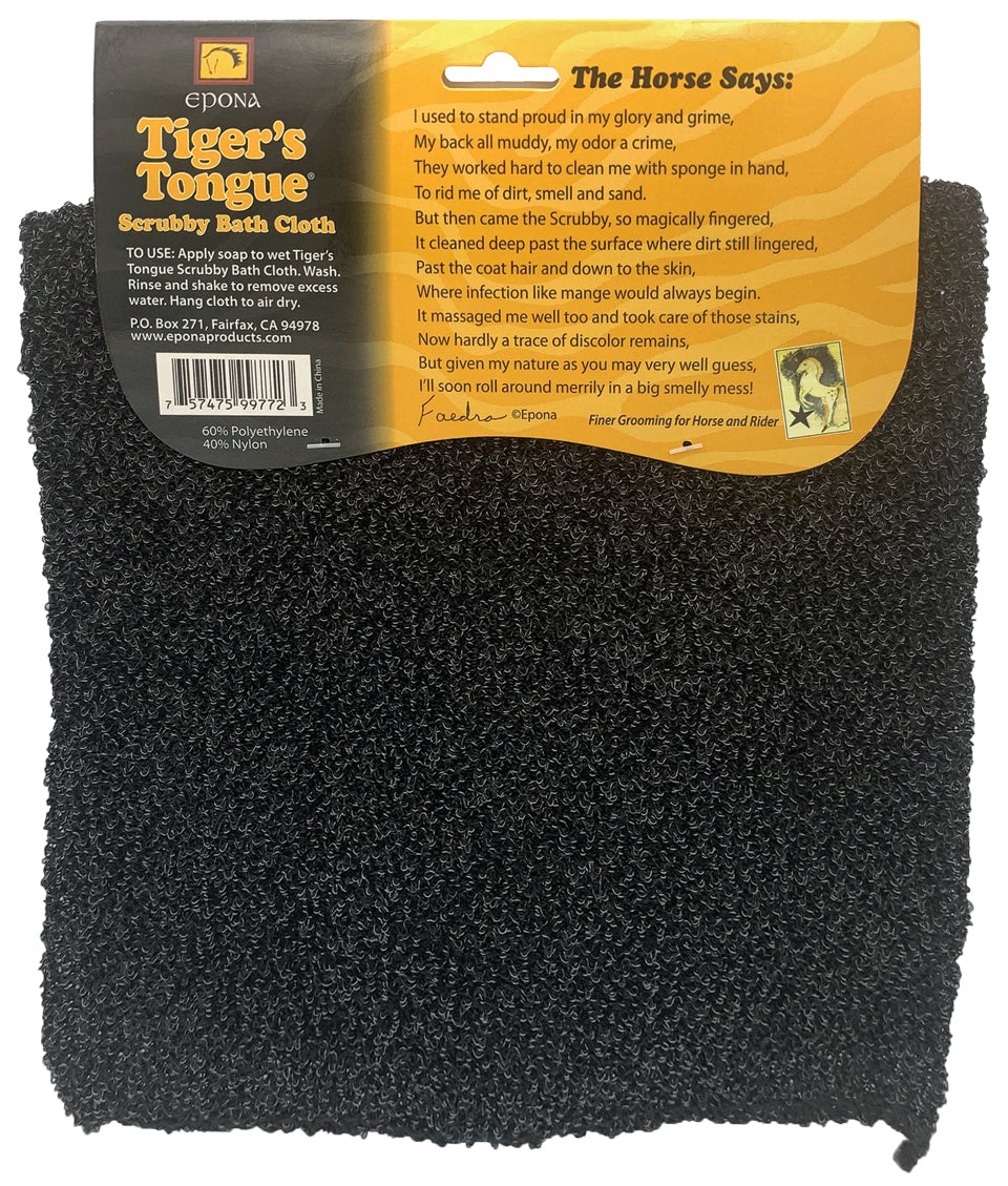 Tiger’s Tongue® Scrubby Bath Cloth, used with shampoo, creates a rich lather and makes your horse’s bath most efficient. The texture of this deep cleansing cloth exfoliates hair and dead skin cells, massages your horse’s coat and removes dirt and stains with ease. Rinses well and dries quickly.