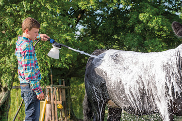 The eZall® Original Formula Total Body Wash powerfully cleans horses, cattle, livestock, and even pets—no scrubbing necessary. This body wash makes it easy to keep mites and fungus at bay: spray on just a bit of the unscented natural formula and simply rinse off the dirt that quickly loosens up. Your animal's skin will be left clean, smooth, and flake-free. Pair the eZall® Original Formula Total Body Wash with the eZall® Shine & Detangler for an all-natural solution to tangled manes and tails.