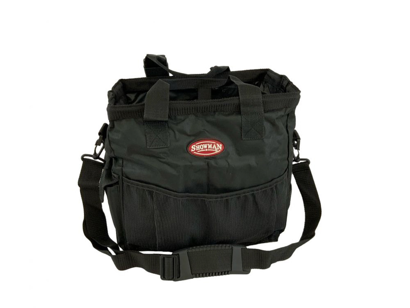 Showman® Nylon Grooming Tote with Mesh Bottom & Handles has multiple pockets that fit most size brushes, grooming supplies and other items.