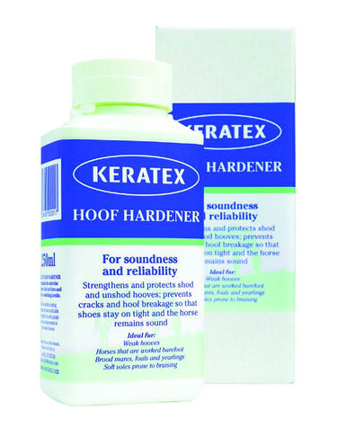 Keratex Hoof Hardener strengthens weak, worn and cracked hooves by improving the molecular structure of the horn itself. This hoof hardener prevents the horn from taking in excess moisture, making it resistant to softening or weakening in wet conditions. This results in a reduction of shoe loss and abscesses. Keratex Hoof Hardener is not an oil or resin layer and does not seal the hoof, ensuring the treated hoof is able to breathe naturally so the moisture balance is properly maintained. It should also be applied to the sole of the hoof to prevent bruising. 250 ml.