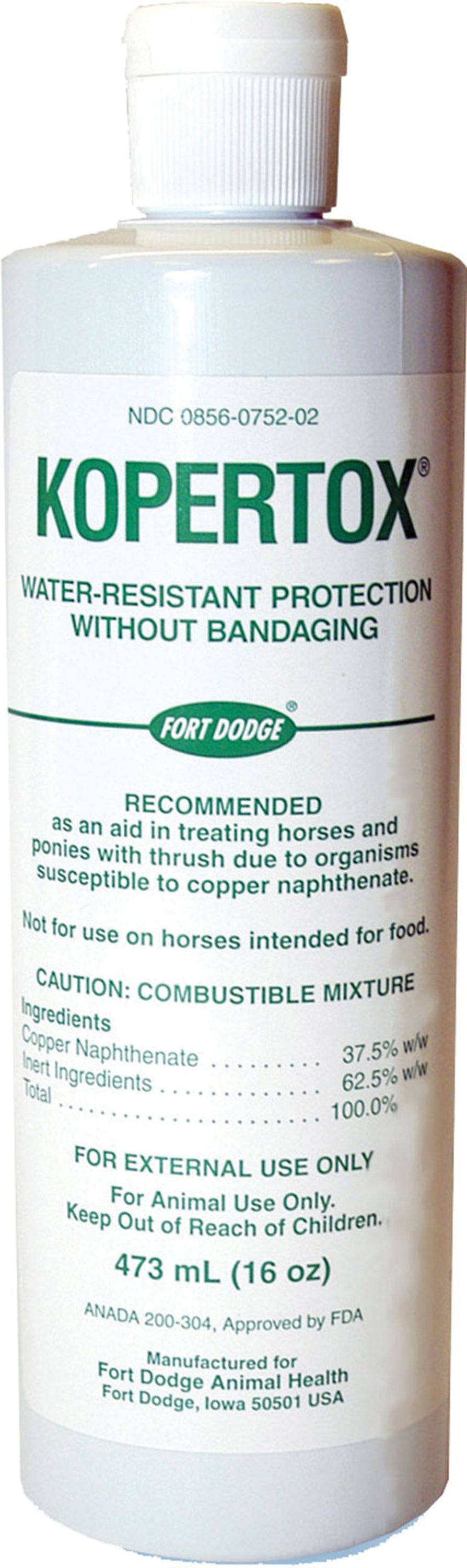 Kopertox® Dressing is formulated for use as an aid to treating thrush, hoof rot, infections, ringworm and superficial sores. It provides water-resistant protection without the need to bandage. 16oz