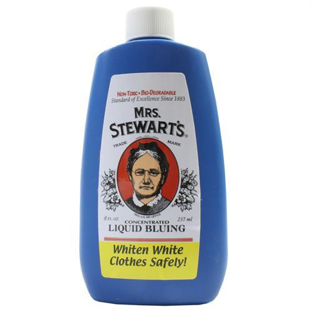 Mrs. Stewart's® Bluing is a concentrated bluing agent. It whitens socks, markings, manes and tails by adding a blue dye, ferric hexacyanoferrate. Liquid is non-toxic, biodegradable, non-hazardous and environmentally friendly. 8 oz.