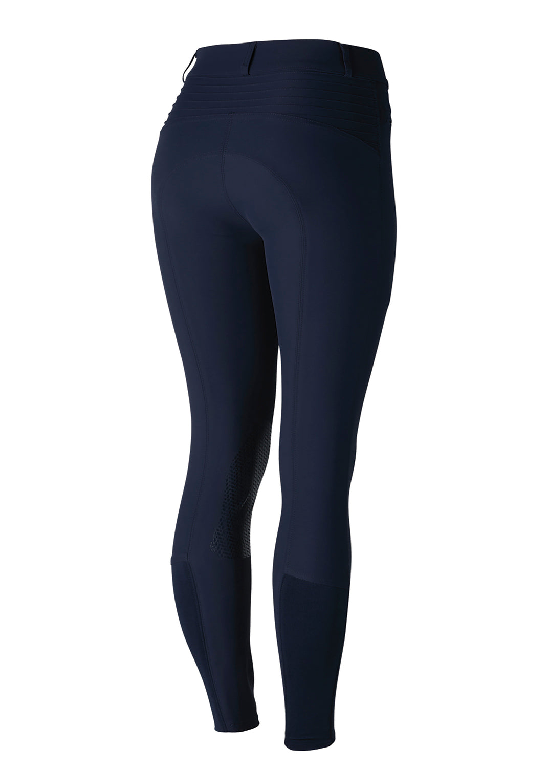 Make a style statement in the new B Vertigo Ladies’ Drea Knee-Patch Breech. With its medium-high waistband, the Drea is extremely flattering, flexible and highly stretchy. Pleat detail in back adds a special elegance. Silicone print knee patches ensure movability in the saddle. A sparkly crystal logo on the thigh completes the look.