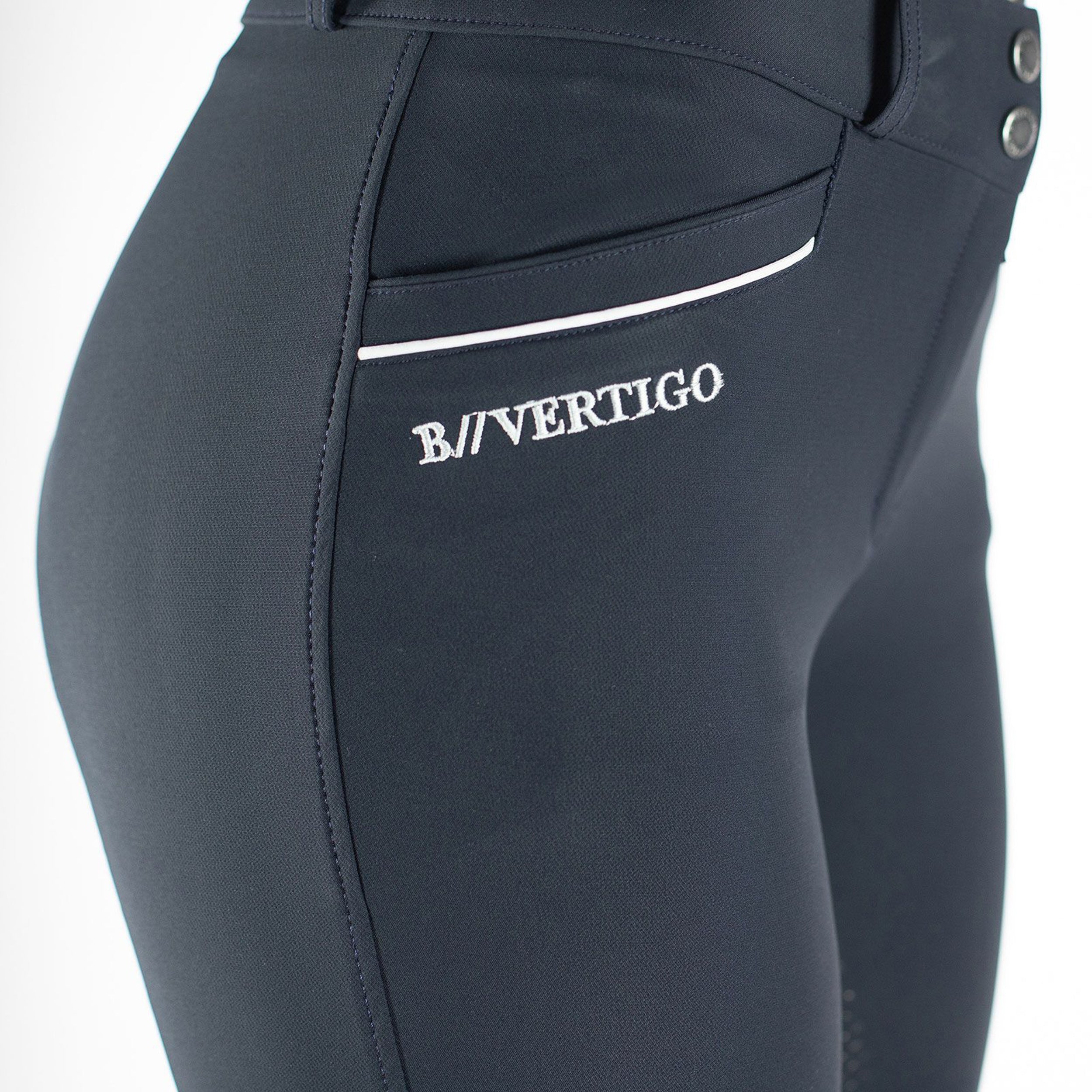The B Vertigo Patricia High-Waist Silicone Knee-Patch Breech is a flattering style offering an optimal fit. A special lining in the front gives support, and a high waist helps improve posture. The Patricia breech is made of dust- and water-repellent fabric embellished with contrast piping for a classy look. Silicone knee patches and stretch panel bottoms combine to provide comfort and flexibility in the saddle.