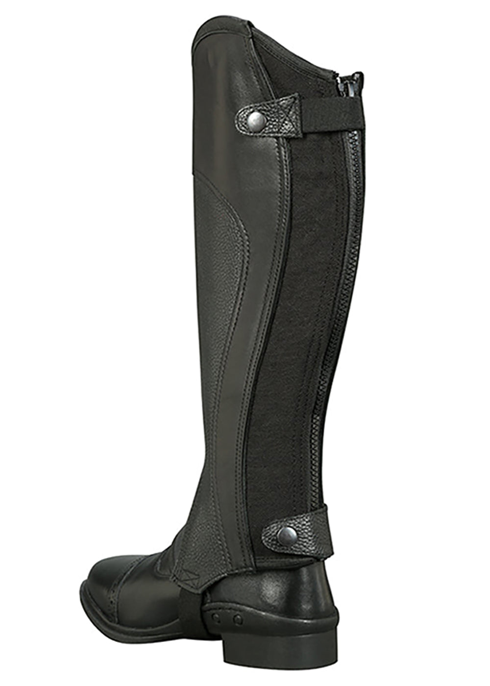 Features of this half chap include a supple contoured fit, wide stretch calf panel, spacious vamp gusset and a strong back zipper the closes from top to bottom. Snap keepers ensure the zip stays secure; sturdy elasticized boot strap helps it stay put.