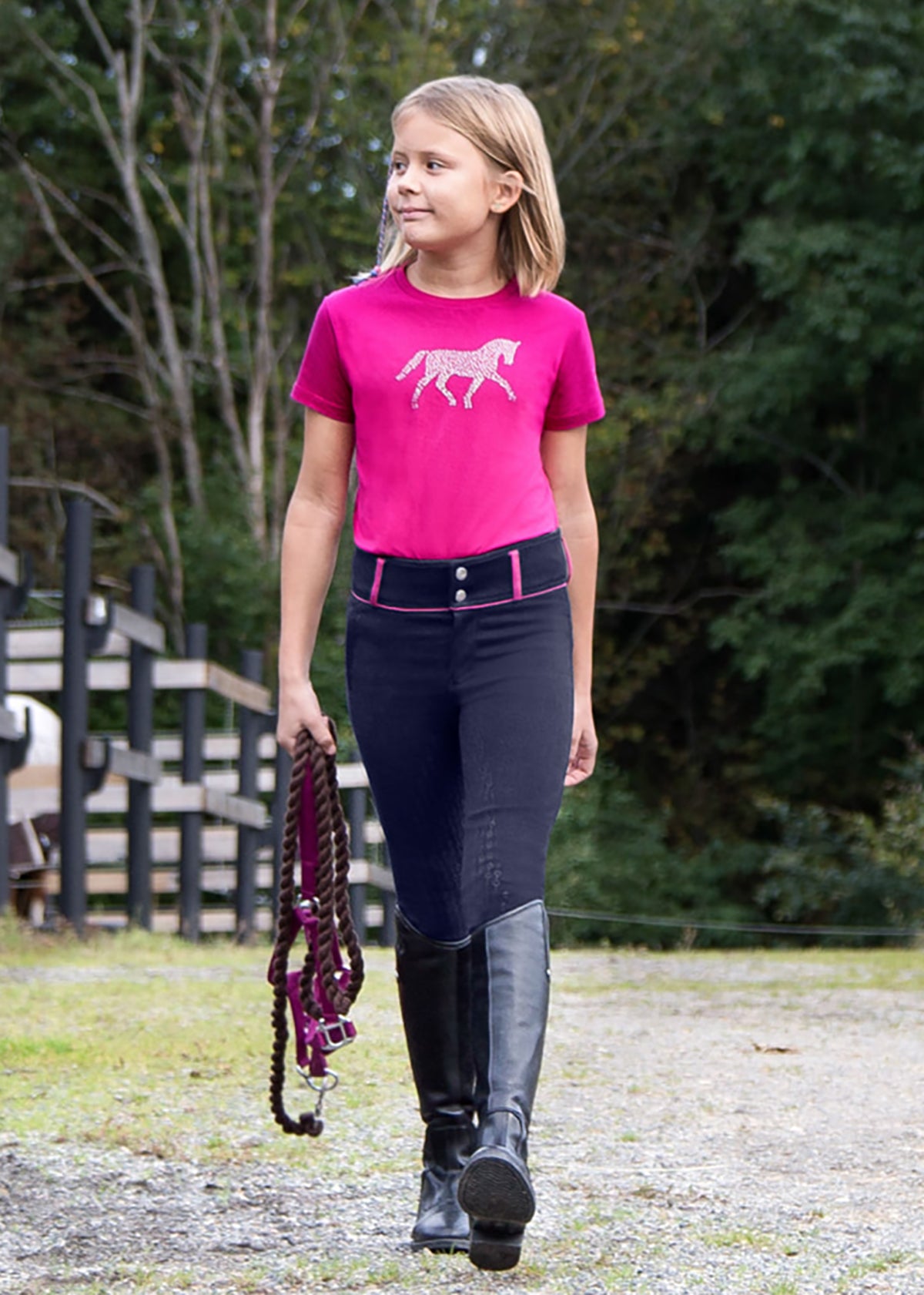 Horze Kids' Daniela Silicone Full-Seat Breech gives your younger rider style and comfort in these traditional style riding pants. A fresh silicone printed seat and thigh area give a modern update on this favorite fit for both kids and teens. The high waist on this traditional breech is comfortable and supportive and slightly higher at the back.