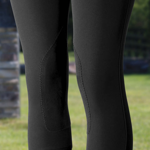 Horze Grand Prix Synthetic Leather Knee-Patch Breech are classically styled in comfortable stretch fabric. Leather-like knee patches adds good grip and a polished look. Lower leg area stays in place under your boots with elastic that is comfortable without feeling bulky. The rear silhouette of these breeches is clean without the interruption of back pockets. Because this breech is made of water- and dirt-repellent material, you will stay cleaner. UPF 50+ benefits your skin. Medium waist.