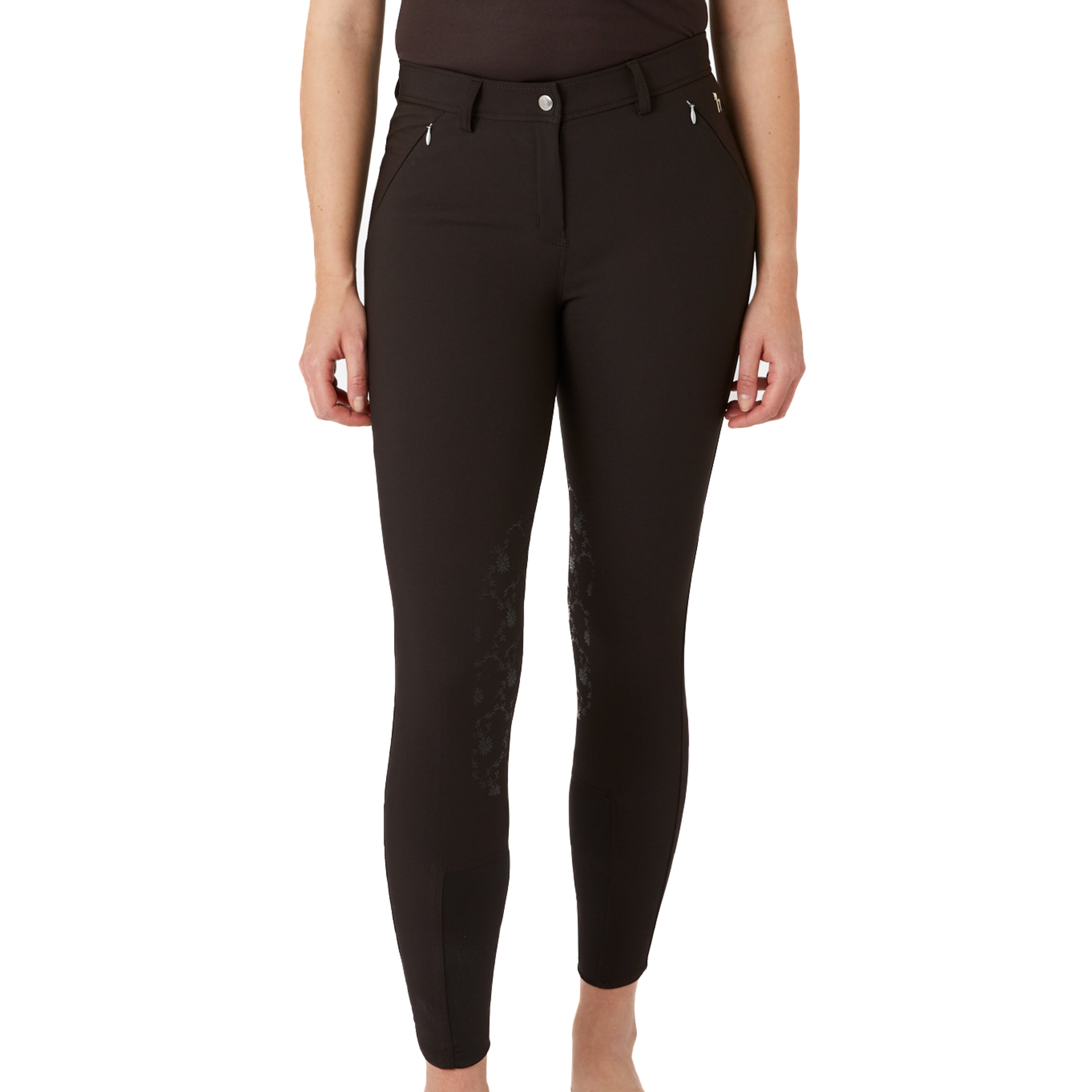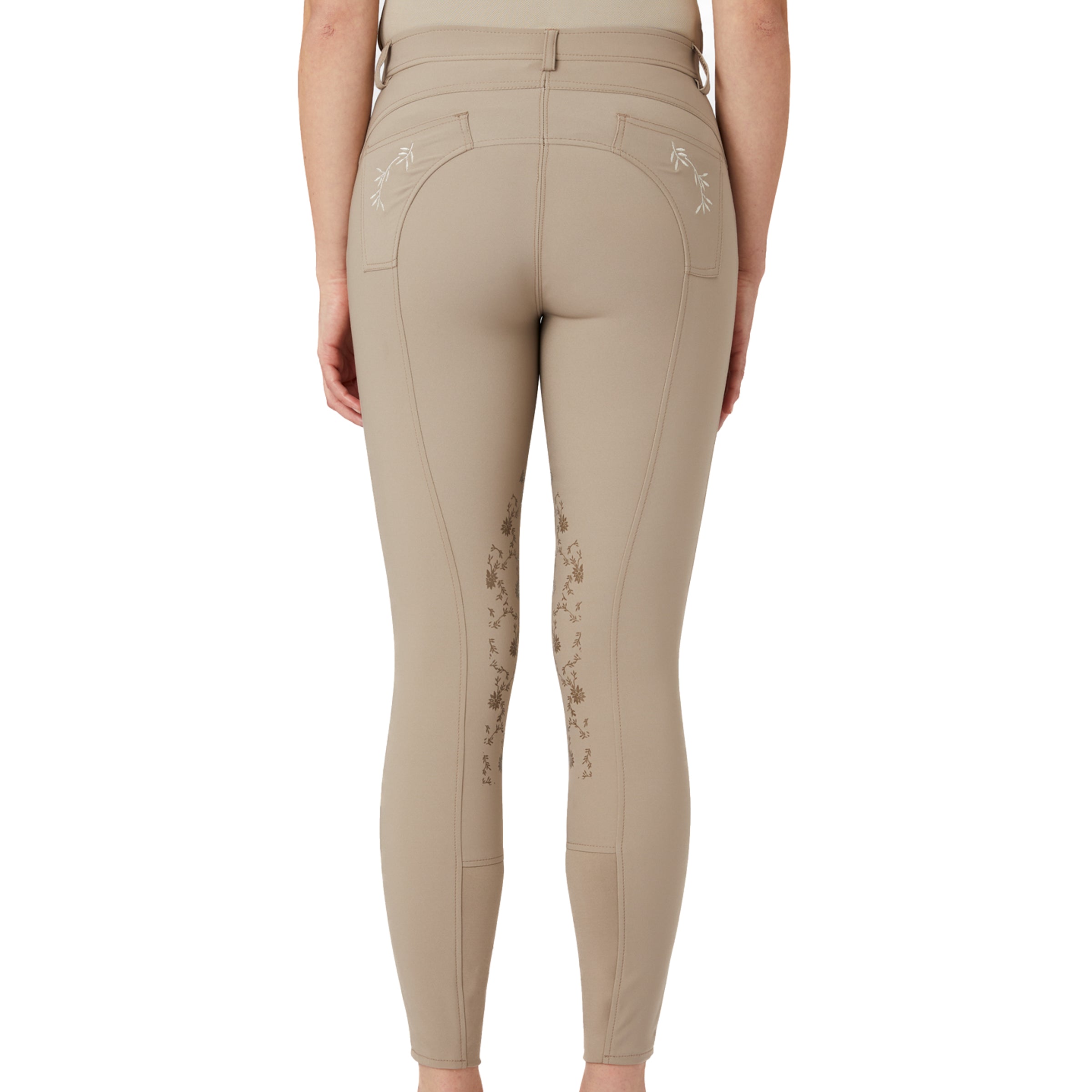 Feminine touches set this Horze Kaitlin Knee-Patch Breech apart. Made from soft, stretchy fabric, it has a clean, streamlined look with angled zip front pockets. Back pockets are embroidered with leaves, and the silicone print knee patches have a coordinating floral motif.
