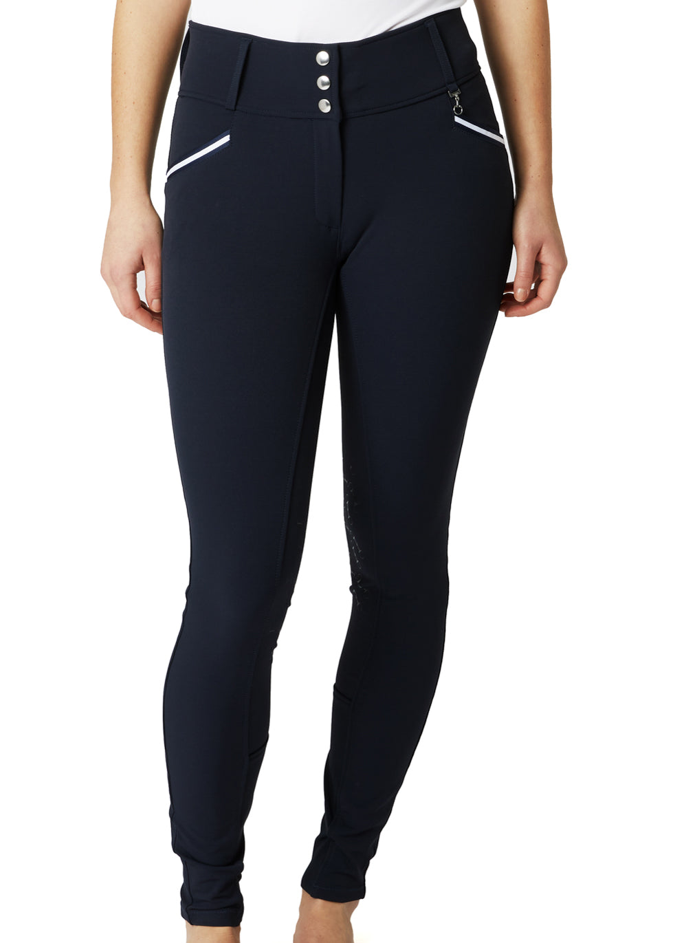 Horze Della High-Waist Knee-Patch Breech is both classic and flattering. Stretch fabric is cut with a high waist, accented with contrast piping and printed with a silicone knee patches.