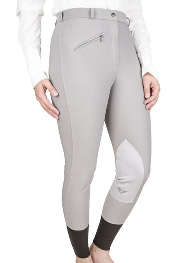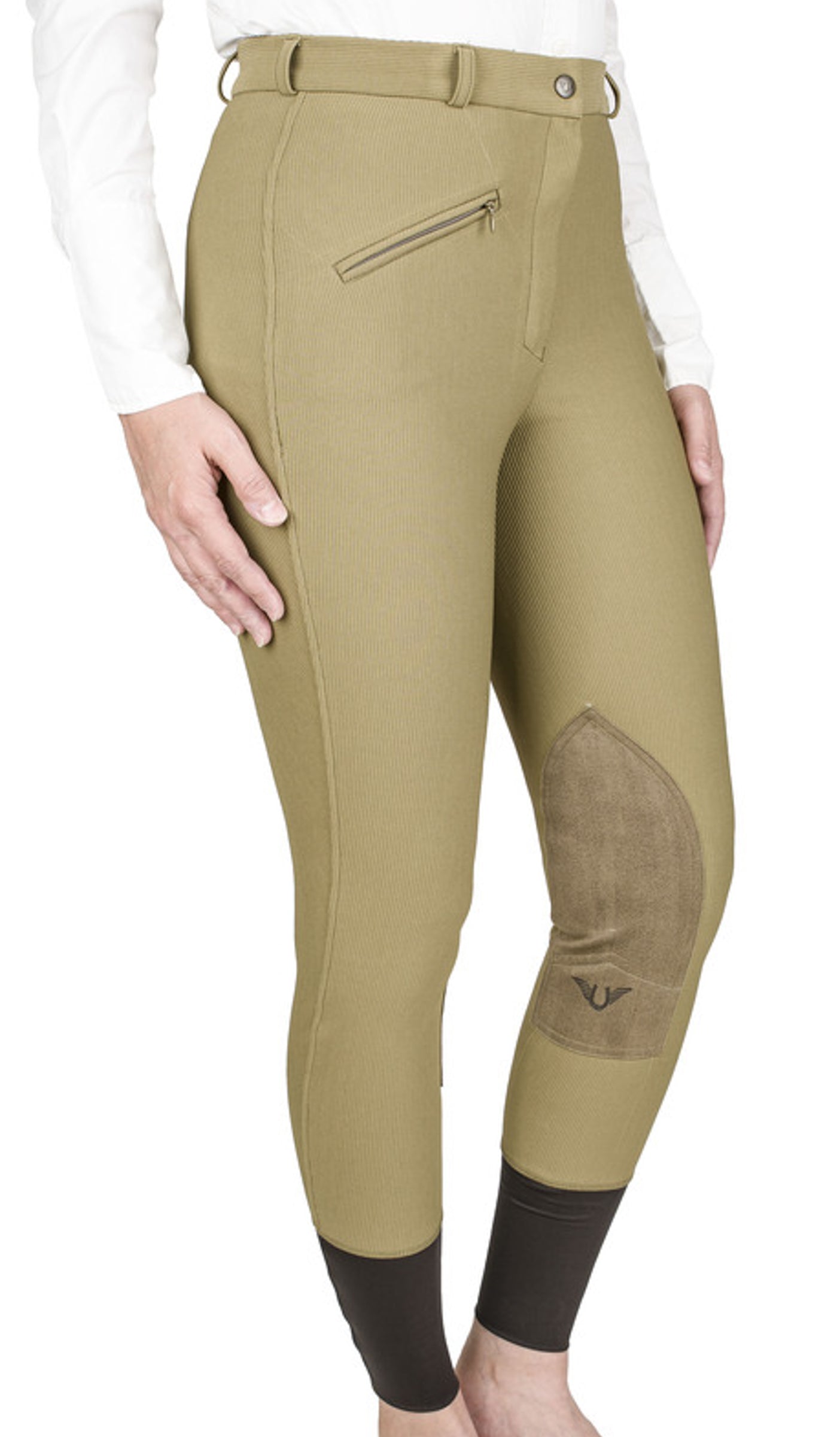You’ll appreciate the TuffRider® Breech for its durability, easy care and budget-friendly price! Long-wearing stretch ribbed fabric offers comfort for riding; UltraGripp™ knee patches provide grip. This classic ladies’ breech is styled with a regular rise, front-zip closure, flattering slant zip pocket and stretchy sock bottoms.