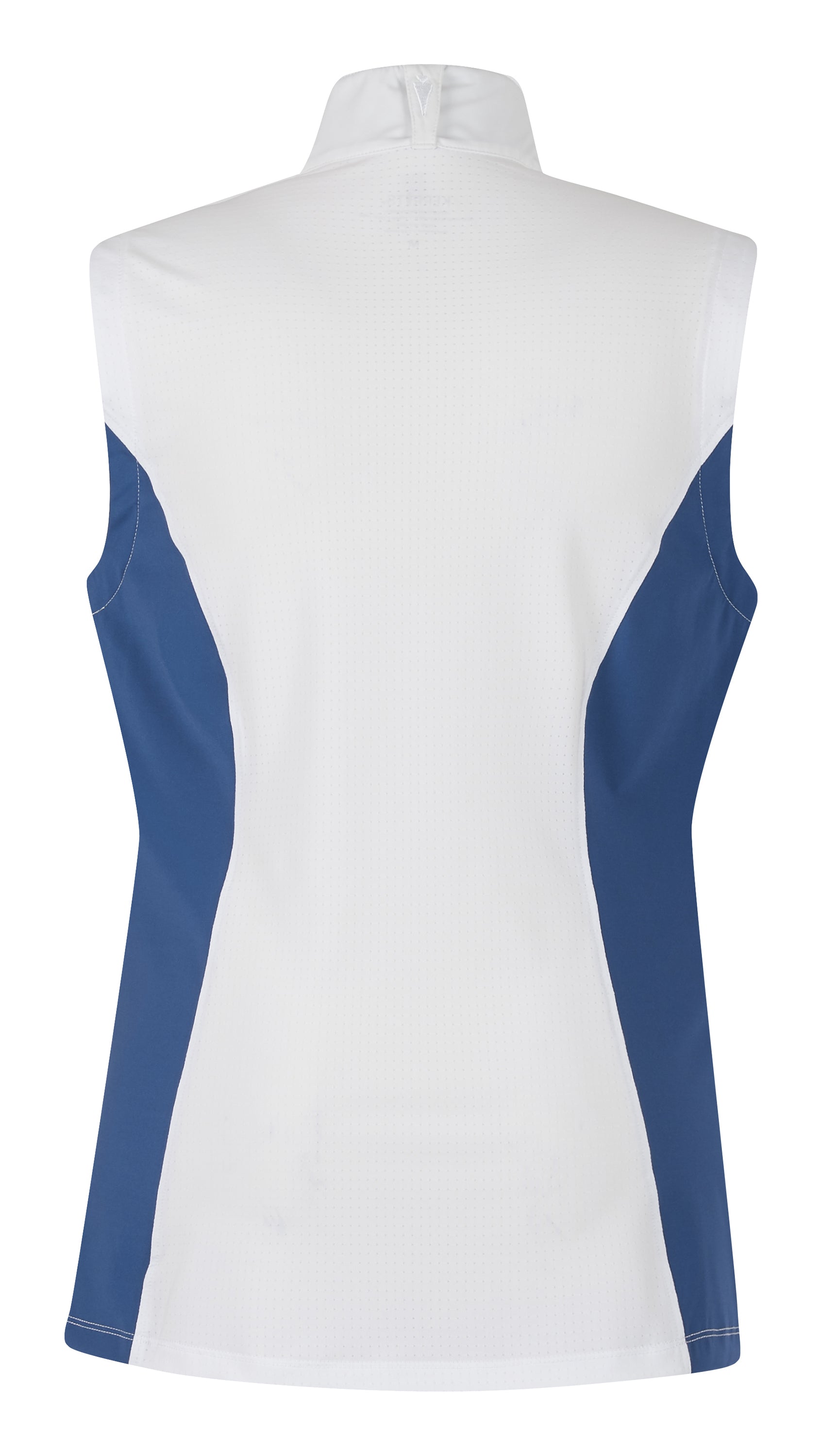 Lightweight, double-knit compression fabric covers and flatters with stylish princess seams and functional four-way stretch. The crisp white collar with stock tie loop is backed by a touch of exclusive print, and the solid color side panels make this a stylish piece to wear all-day, even after exiting the show ring. The hip-length hem stays perfectly tucked in while riding.