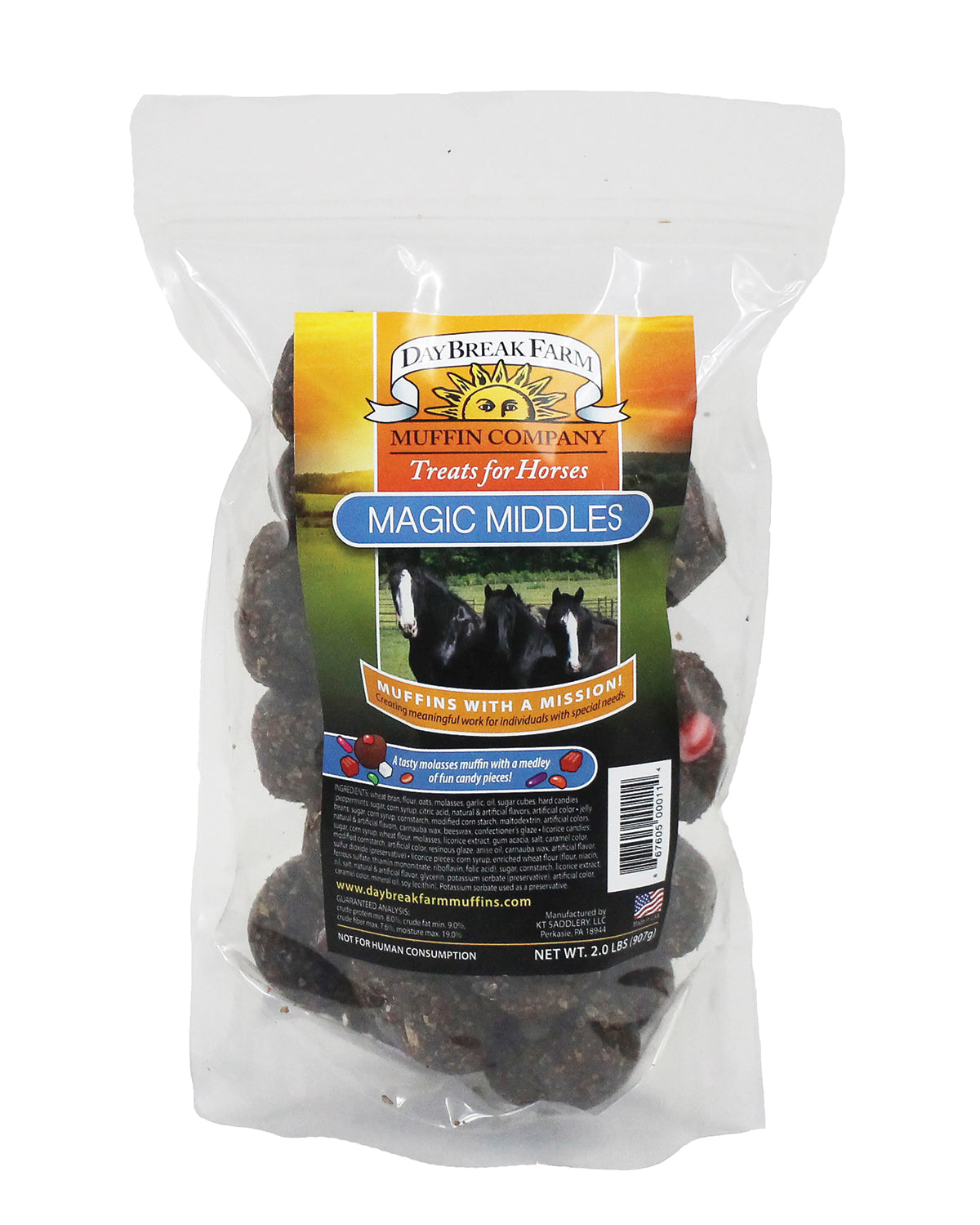 Daybreak Farm Magic Middles Muffins are tasty molasses muffins for horses. They feature a medley of fun candy pieces in their middles designed to surprise and delight your horse or pony.