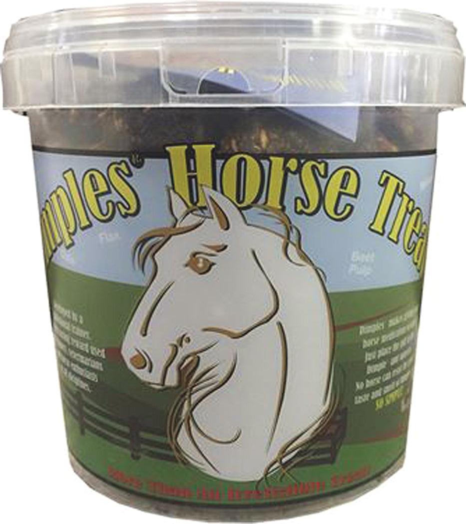 Dimples® Horse Treats with Pill Pocket make giving your horse a pill easy. Just place the medication in the dimple of the treat and squeeze gently to seal the pill inside. This irresistible treat takes the guesswork out of administering your horse’s medication. Used by trainers, veterinarians and horse owners across all disciplines, it’s made from simple ingredients including ground flaxseed, a natural supplement with anti-inflammatory properties. In fact, each Dimples treat contains a teaspoon of ground flaxseed. It also contains beet pulp, molasses and whole grains which combine to create a soft, pliable texture and an enticing aroma. Your horse will never know he’s getting medication instead of a flavorful reward. 3 pounds.