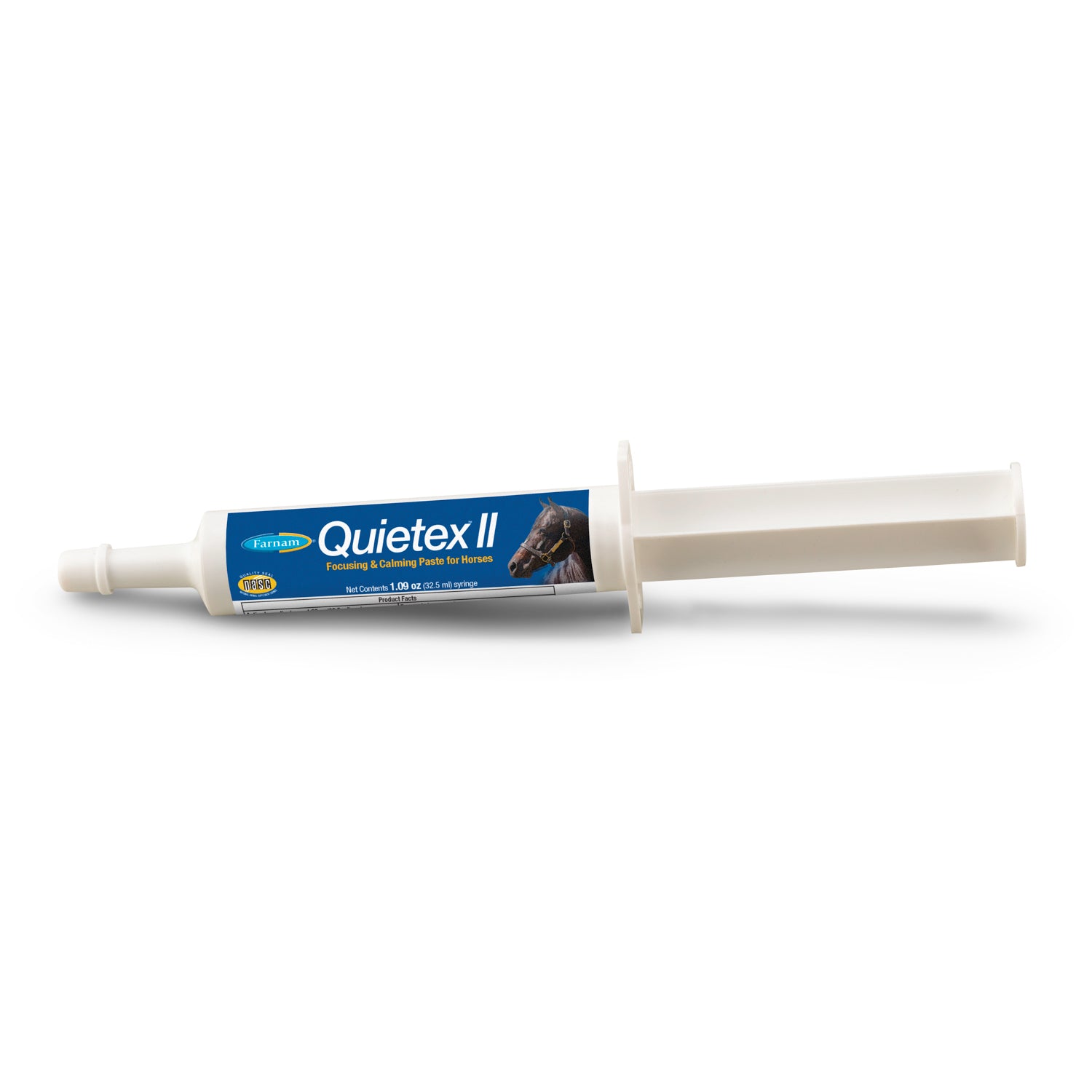 With a unique combination of stress-relieving ingredients, Farnam® Quietex II™ Focusing & Calming Paste helps keep horses calm, focused yet alert during training. This calming supplement is ideal to use for stressful situations, such as trailering or veterinary visits, and it won't cause drowsiness or impede performance. Administer entire contents of tube two hours prior to stressful event. Active ingredients: L-tryptophan, thiamine, inositol, magnesium, vitamin B6, valerian root extract. 32.5 ml single dose oral syringe.