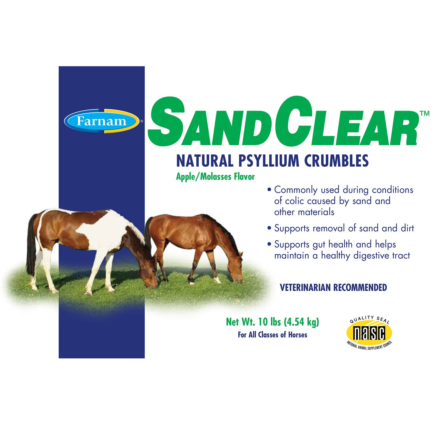Farnam® SandClear™ contains 99% psyllium which absorbs water and forms a gel-like substance in the horse’s intestines. Psyllium as the active ingredient increases bulk, softens stools and helps remove sand from the horse’s ventral colon. This sand and dirt can be ingested as a horse eats hay or other forage.