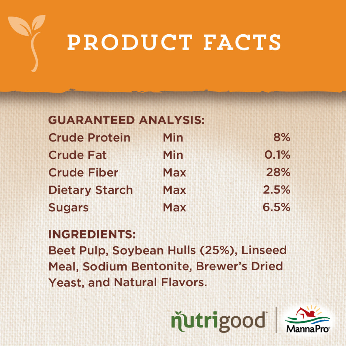 Ingredients: beet pulp, soybean hulls (25%), linseed meal, sodium bentonite, brewer’s dried yeast, and natural flavors. Re-sealable bag. 4 pounds.