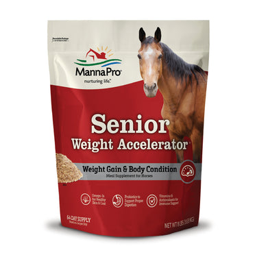 The MannaPro® Senior Weight Accelerator® is formulated to help older horses gain weight. Designed to help address the special health needs of senior horses, this weight gain supplement provides the high fat and essential calories needed to gain weight, plus essential vitamins, Omega-3 and probiotics to support overall body condition.