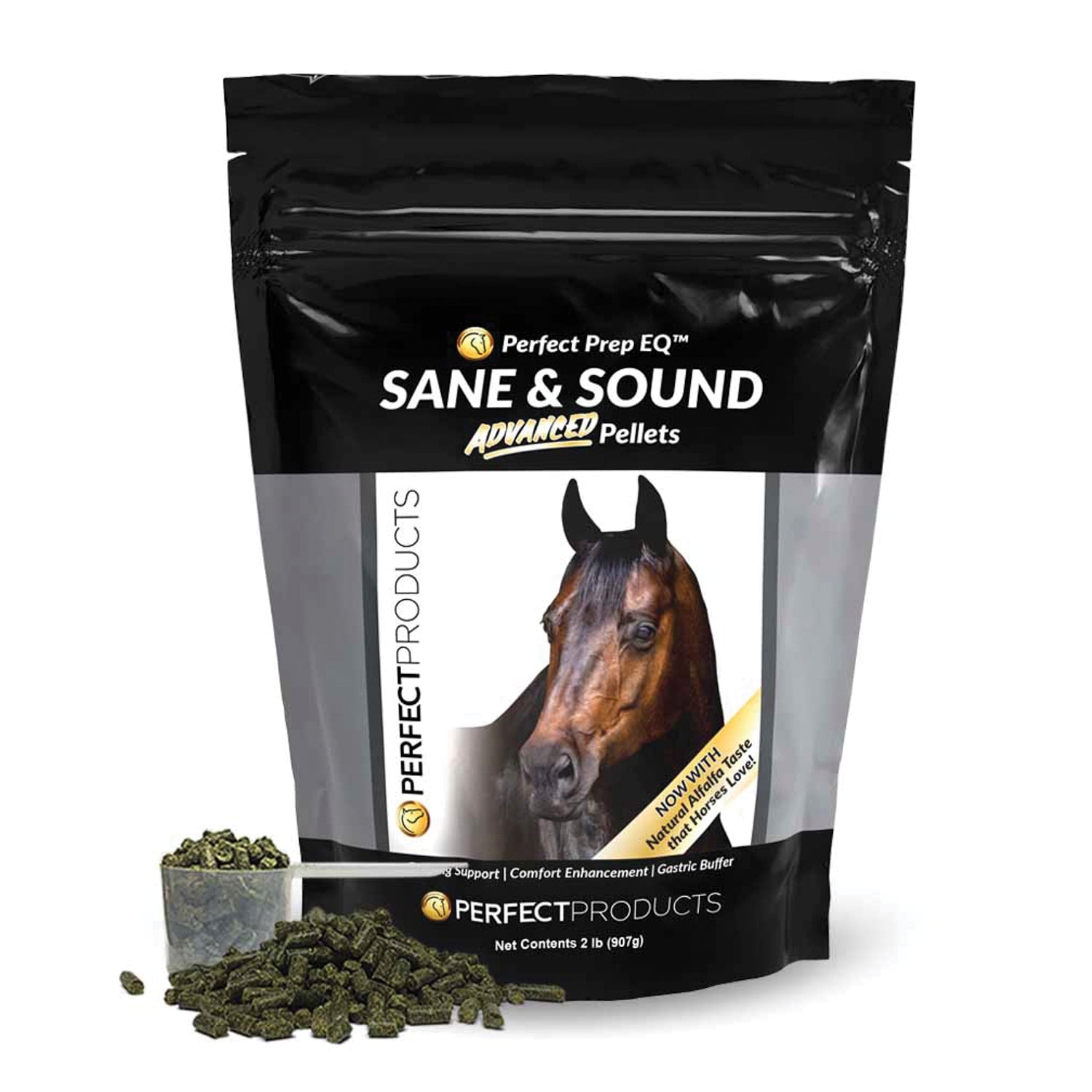 It’s free of prohibited substances and is easy to administer as top dressing on rations. Effects begin immediately and peak after four to six feedings. Sane & Sound may be used alone or in combination with any Perfect Prep formula. Feed 2 scoops (40 grams/scoop) with AM and PM feed, with a feeding four hours prior to event. Ingredients: amino acid complex, magnesium, DL-phenylalanine, inositol, glycine, taurine, thiamin, leucine, riboflavin, pyridoxine and sodium copper chlorophyllin.