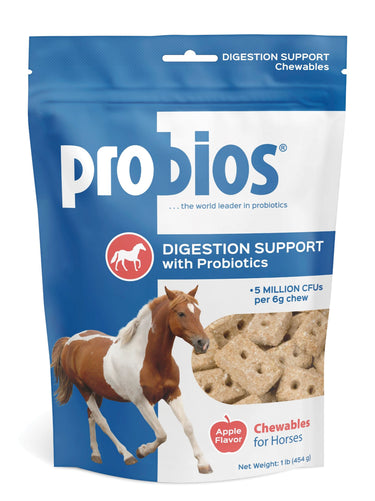 Probios can be helpful to horses when it is administered after worming, during times of stress, weather changes, ration changes, birth and weaning, antibiotic therapy or other conditions such as diarrhea. 1 pound of treats is packaged in a resealable pouch.