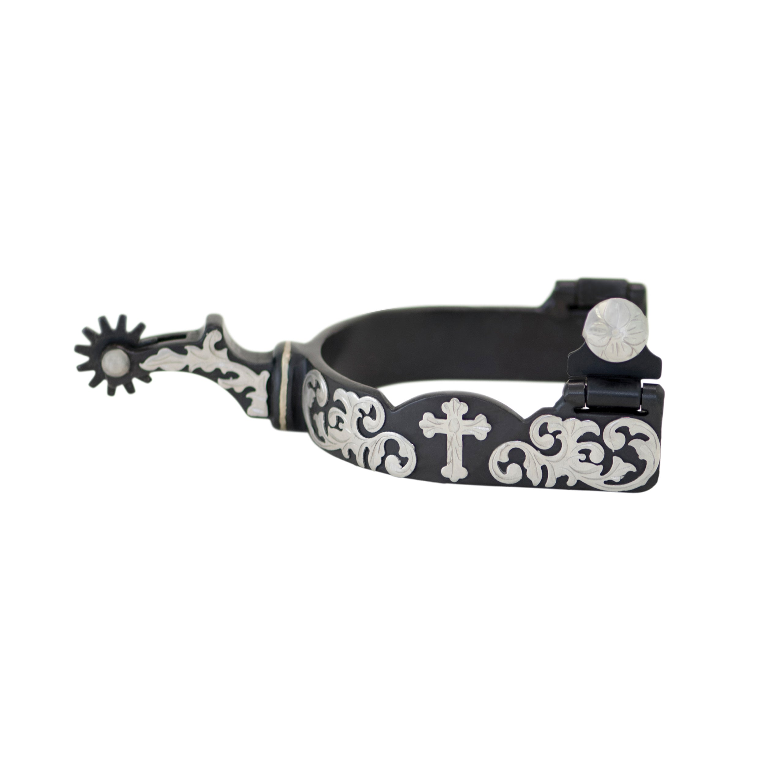 The Metalab Floral Cross Spur is a Level Two Western spur in raw steel with black satin finish. Medium cup, stainless steel floral trim and cross and chap guard.