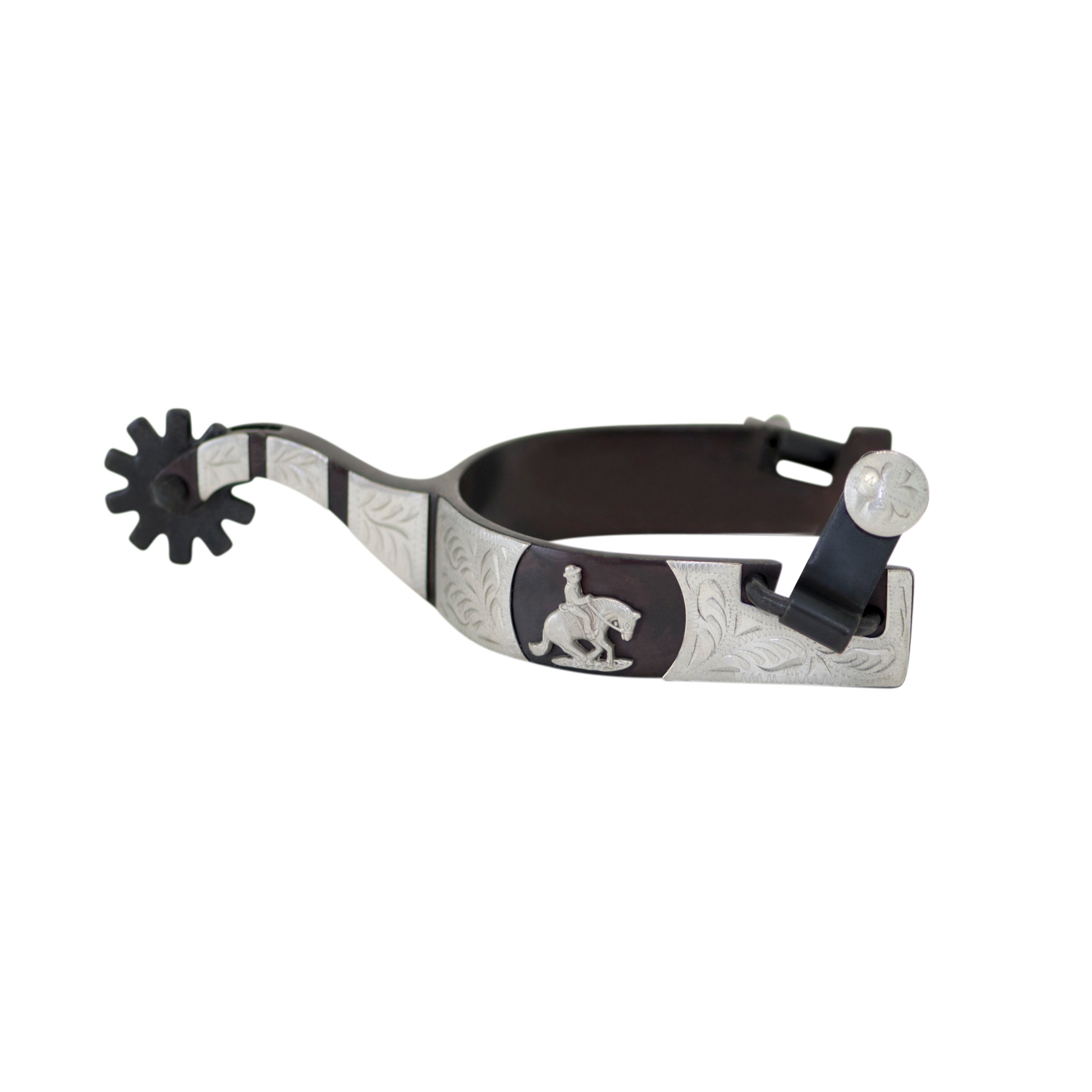 Metalab Reining Spurs are Level Three and made of raw steel with a black satin finish. Engraved stainless steel trim and a sliding reiner motif on the band. Large cup, curved shank.