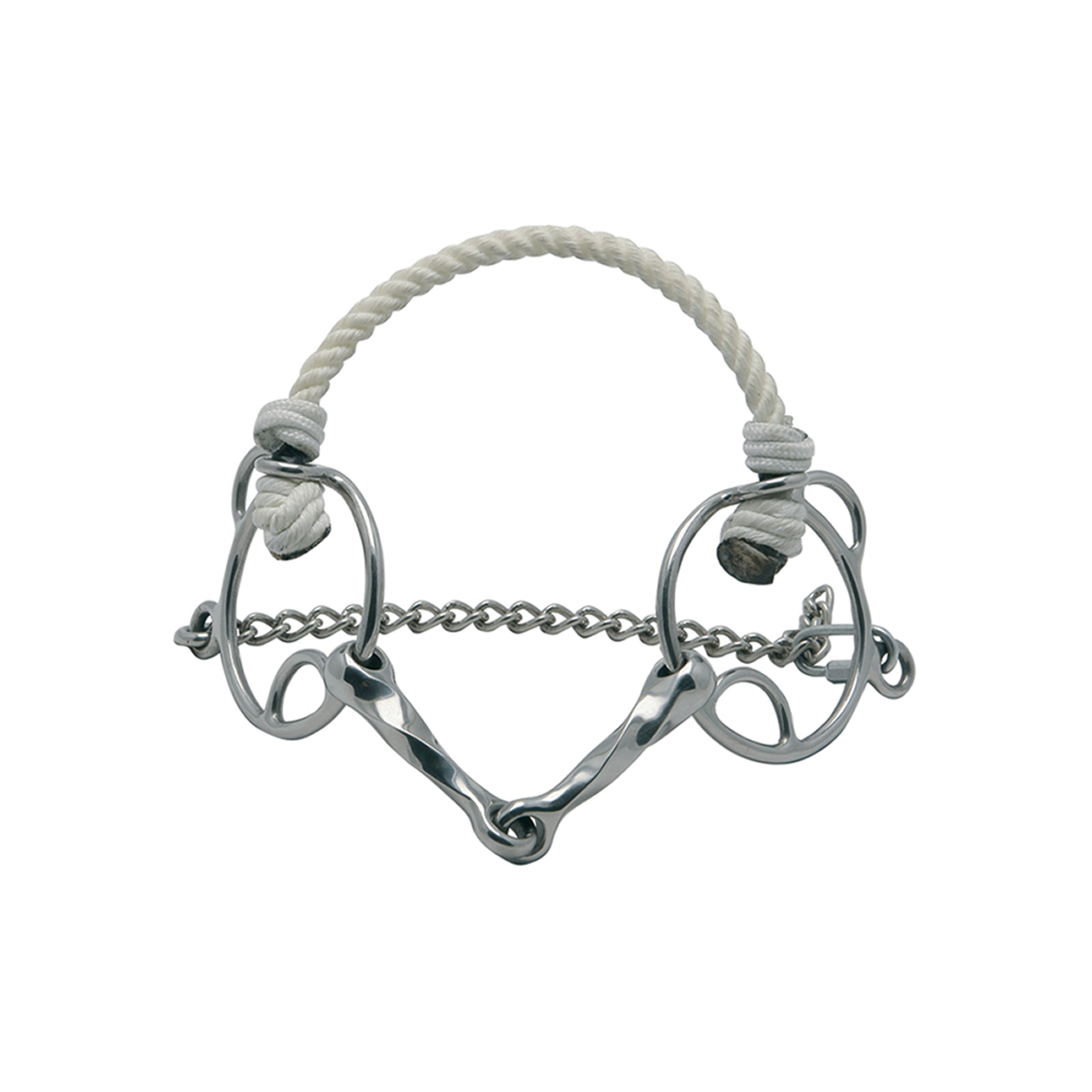 The Metalab Single-Jointed Twisted Combination Hackamore Bit with Rope Noseband is a Level 5 design. Finish is stainless steel. Mouthpiece is twisted single jointed with curb chain and gag cheeks.