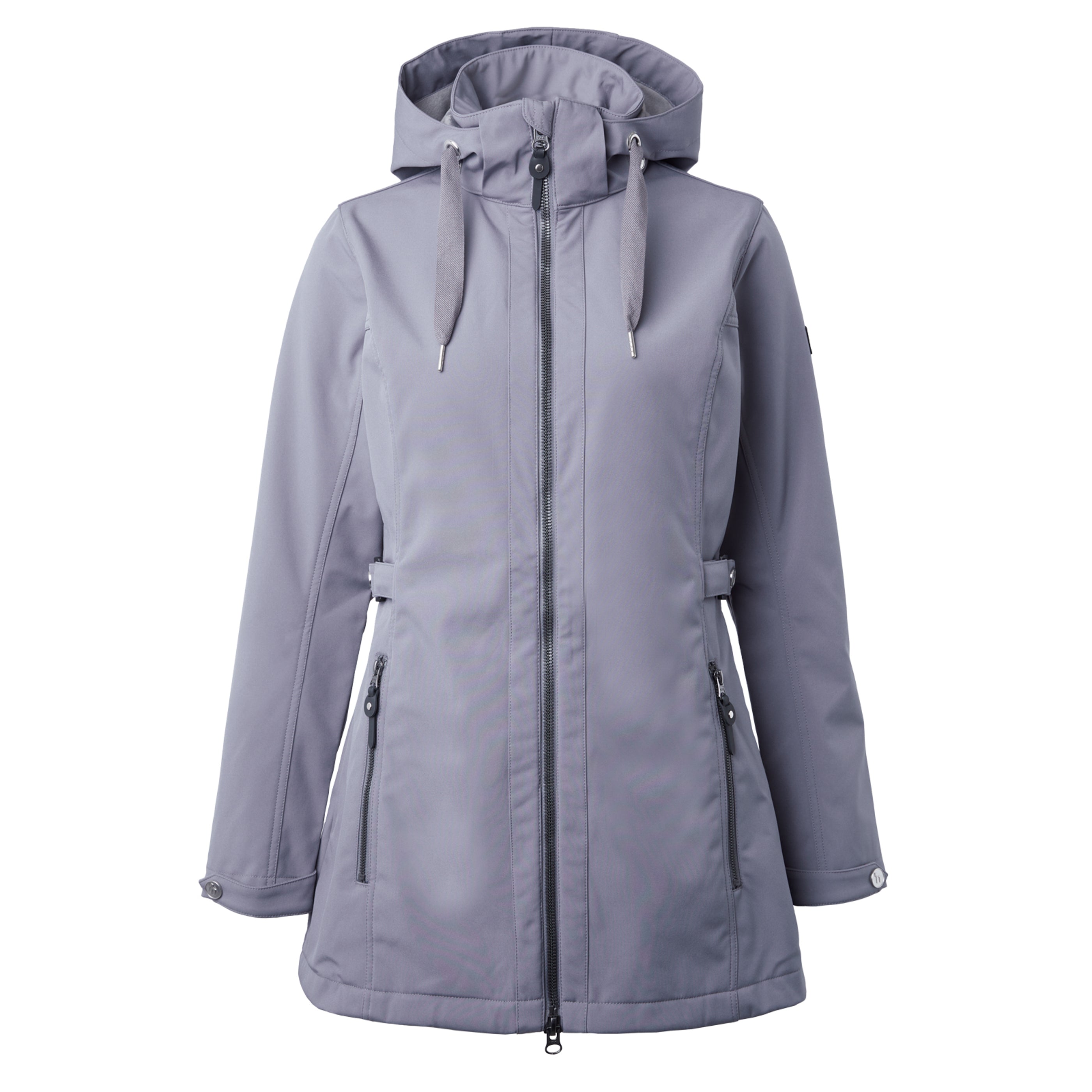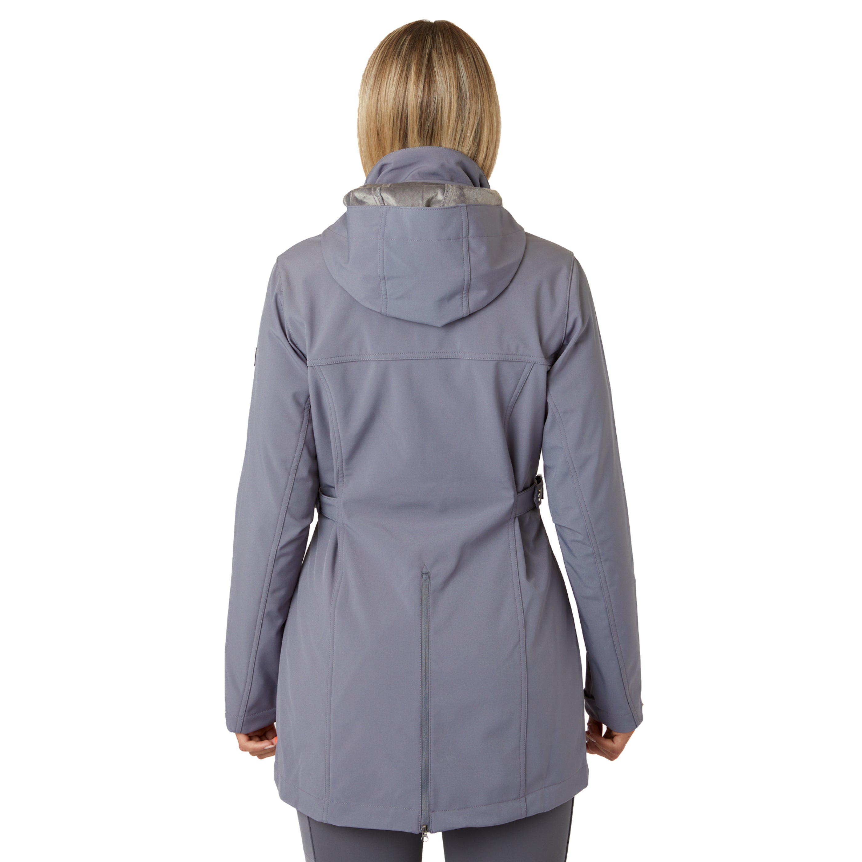 Horze Freya Long Soft Shell Jacket has all the weather protection features you need and the riding features you want. Soft shell fabric has a waterproof, breathable outer and a fleece lining which makes this comfortable, long jacket a great choice. A flattering style, it boasts a vented back to allow you to cover the saddle without interfering with your ride. Adjust the waist with straps and press buttons to achieve a custom fit. Side pockets and a two-way zipper finish the clean look. Technical specs: 3000mm waterproof, 1000mvp breathable, no taped seams.