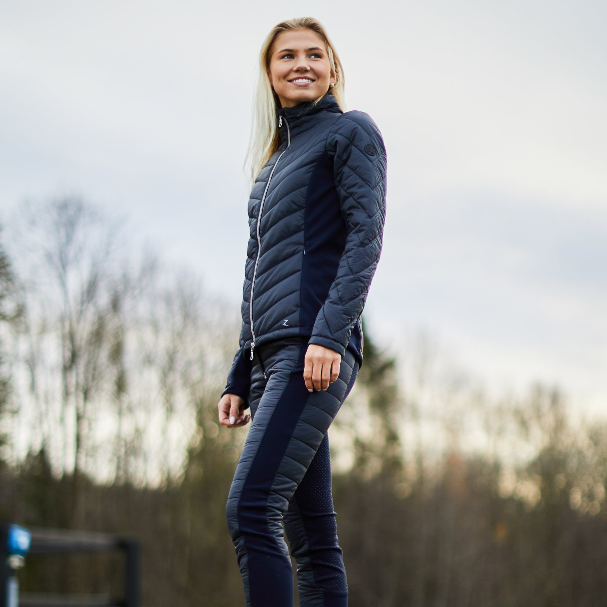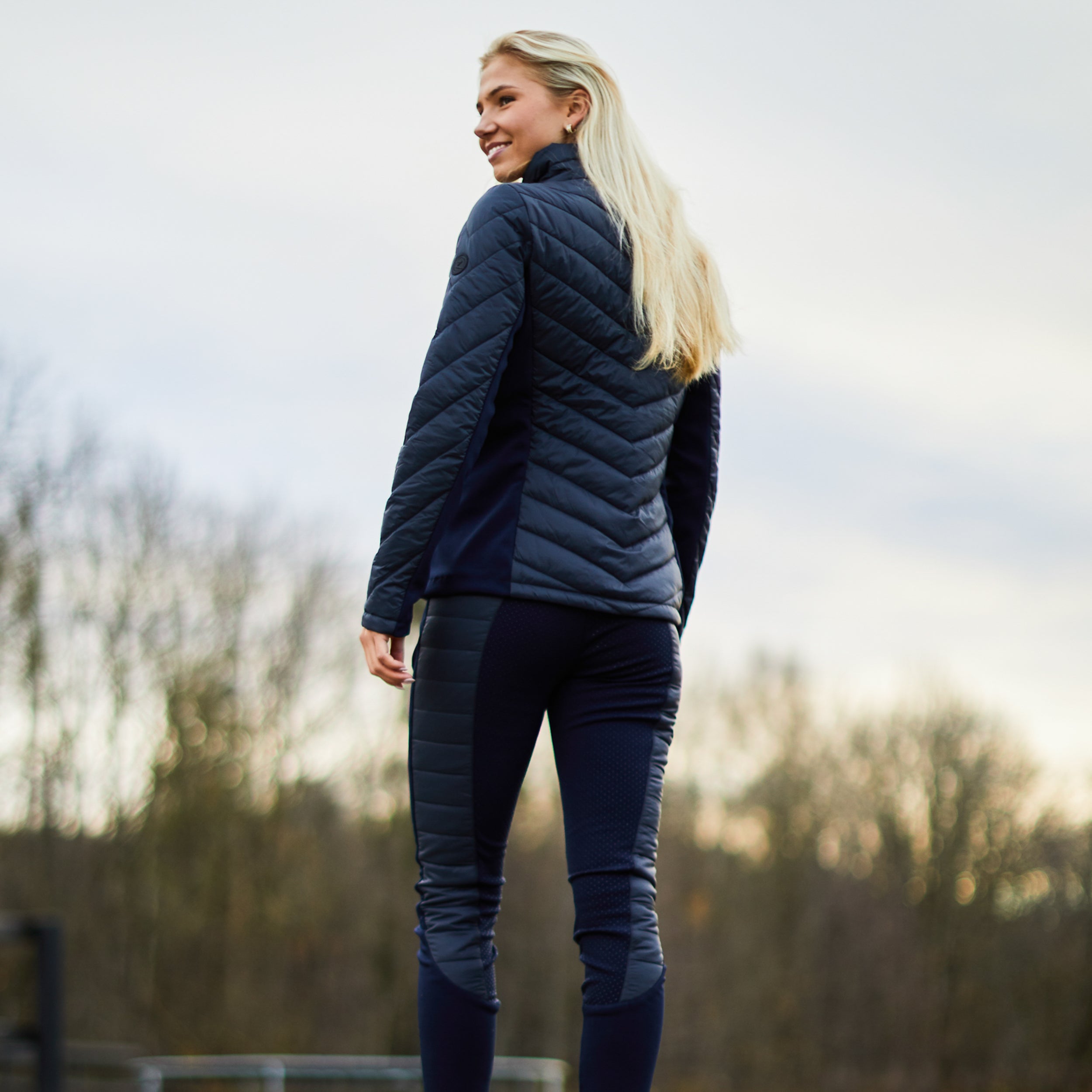 The Horze Ladies’ Isla Padded Hybrid Jacket is functional and sporty in the saddle. Quilted and insulated upper sleeve, front and back panels offer warmth and water resistance where you need it; elasticized four-way stretch fleece side and lower sleeve panels provide breathability and flexibility.