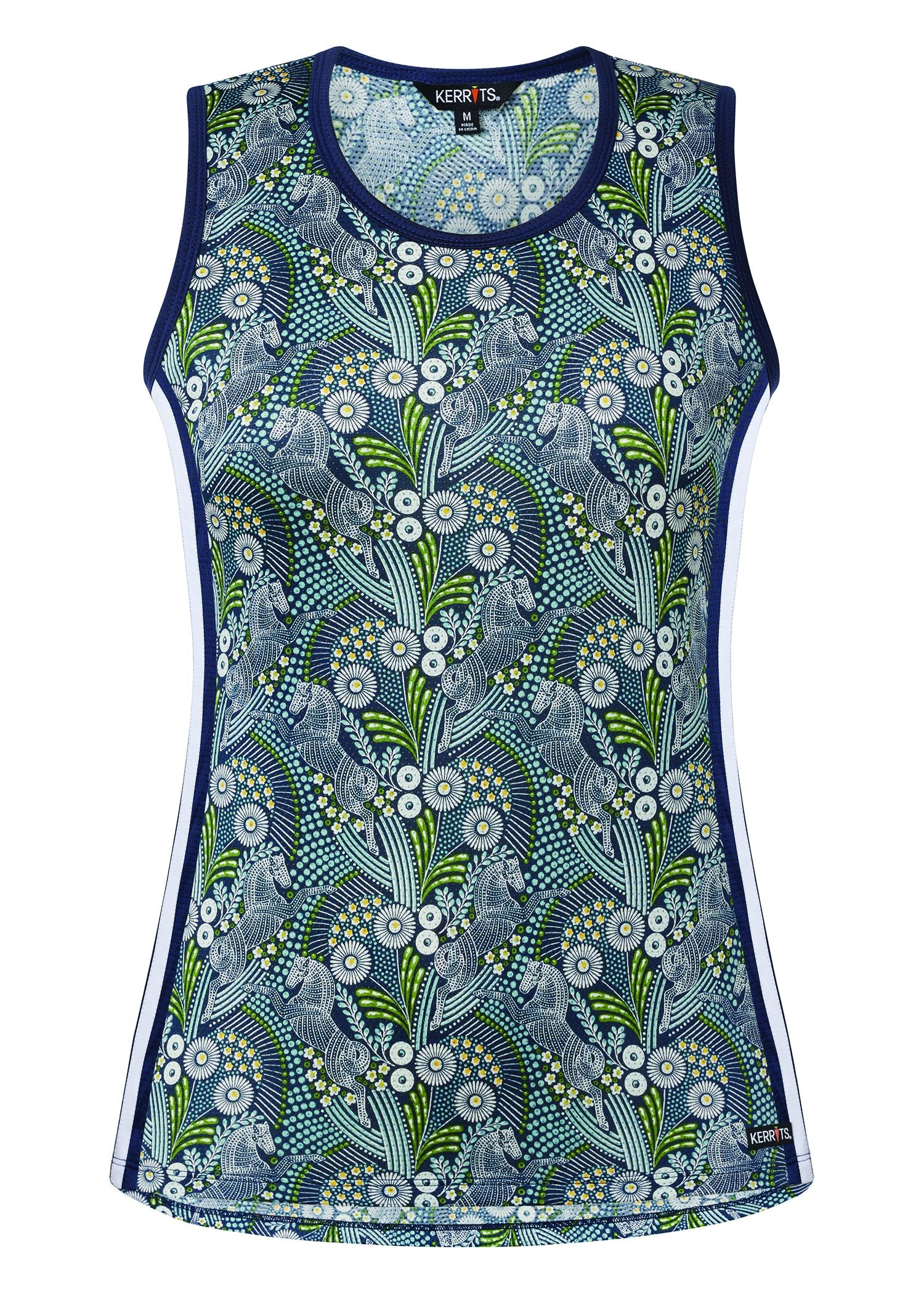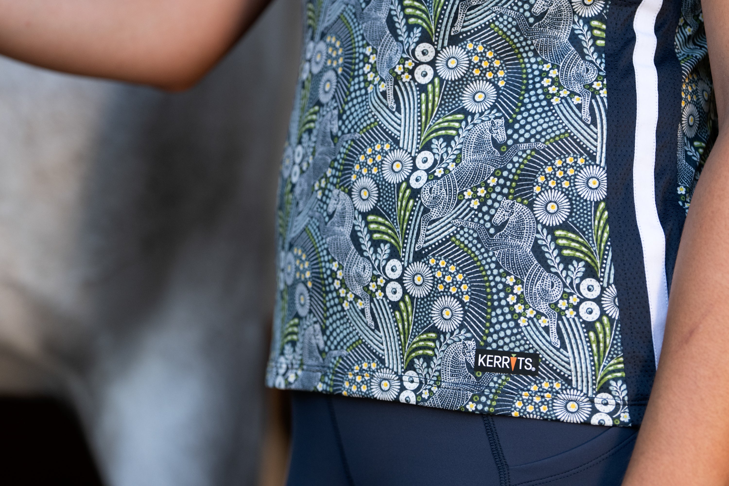 Wide straps cover bra straps, and a flattering equestrian hem keeps you covered as you move. Sporty, contrast stripes down the sides of the shirt coordinate with Kerrits tights and breeches.