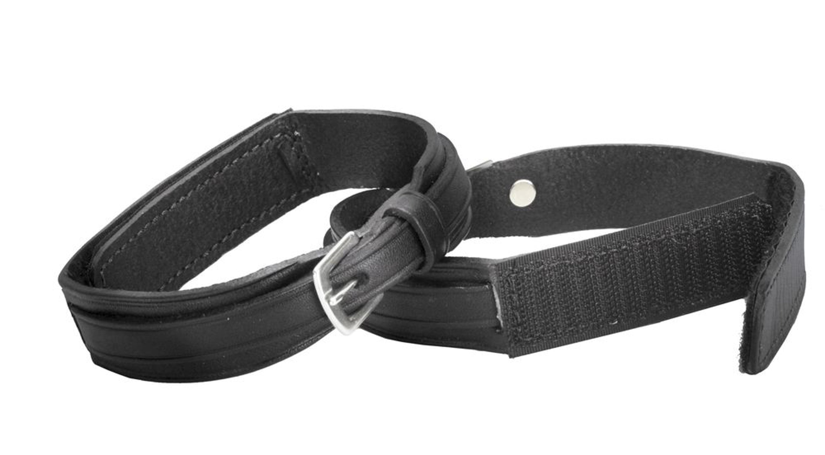 Made in the USA from black leather, these Tory Easy Jod Garters with Hook-and-Loop Closures allow show day to run most smoothly. The design looks classic but eliminates the need to wrap and buckle. The 1" wide leather garter strap has a 1/2" wide leather overlay and a decorative stainless steel buckle. The stitched-on hook-and-loop fastener secures the garter to the leg in an instant and with an ideal fit. Pair.