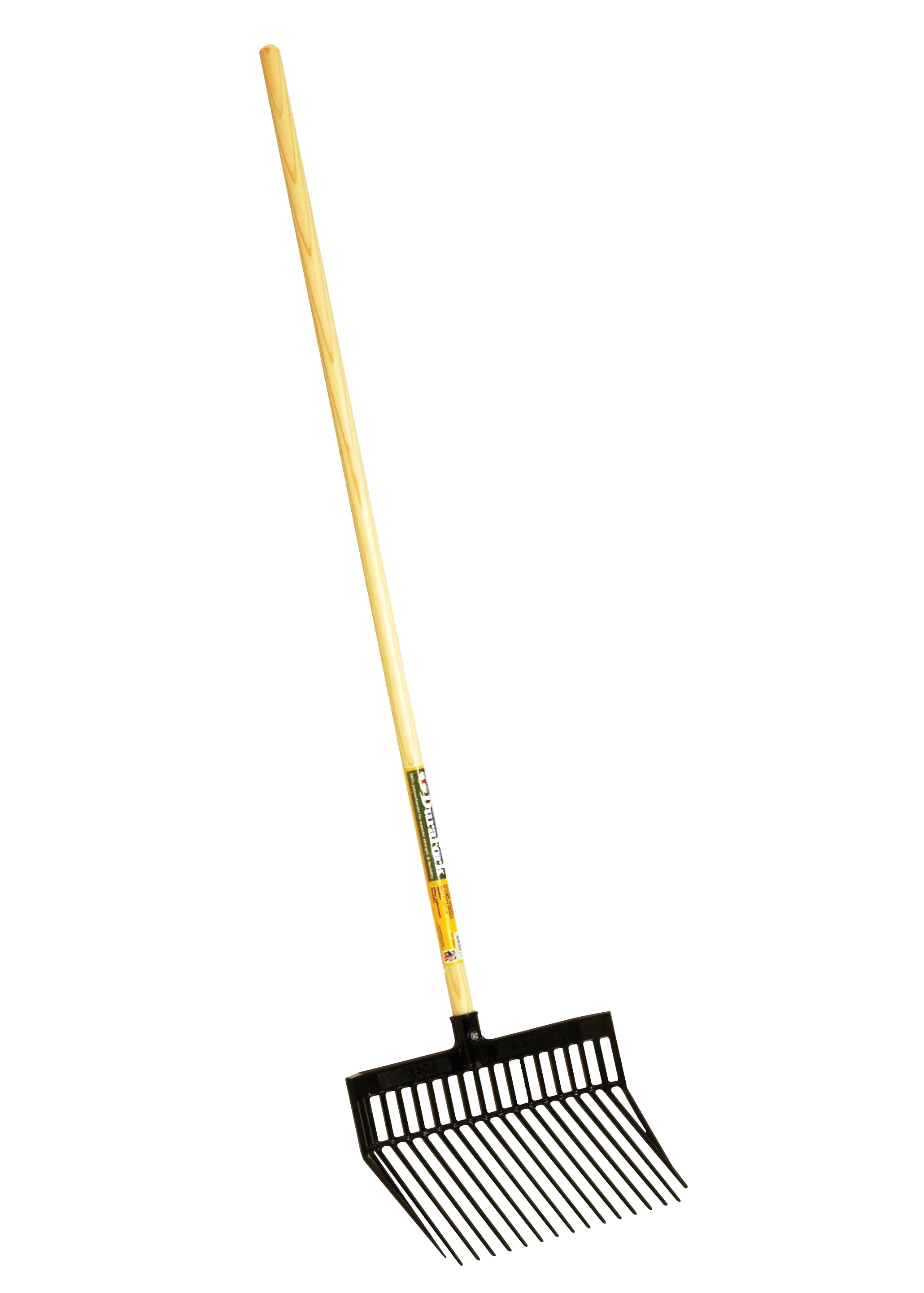 The Little Giant® Dura Fork Original bedding fork is a fixture in stables and barns everywhere. Manufactured from extra-strong 100 percent polycarbonate to provide super strength and flexibility. Designed for long-lasting use around the farm, ranch, and home. Specially designed tines are uniquely angled to provide easy manure pickup with less spilling. Polycarbonate fork head is 13.125"L x 15.125"W and the wood fork handle is 52"L. Lock nut secures the handle.