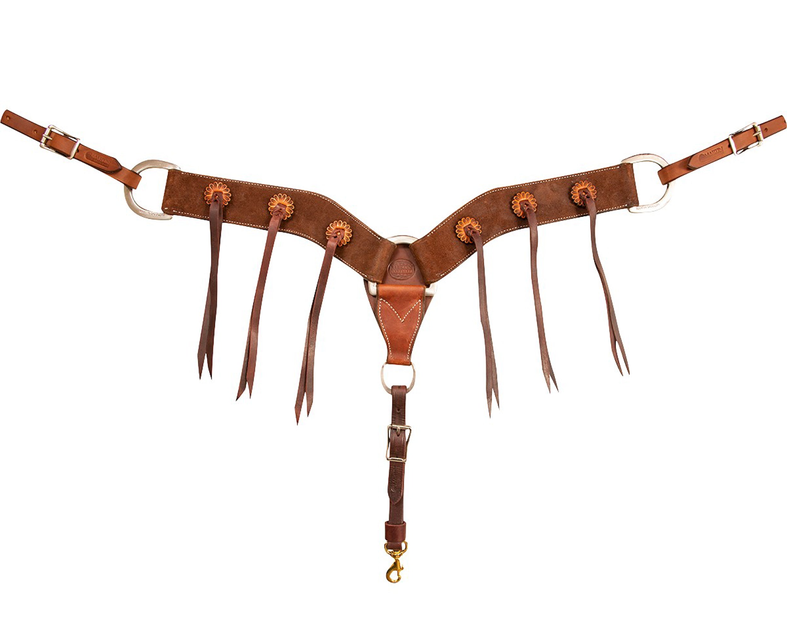 The Martin Saddlery® Breast Collar with Rosette Blood Knots is made from durable and attractive chocolate roughout leather enhanced with tied rosette blood-knot accents for a show-stopping, cowgirl-inspired look.
