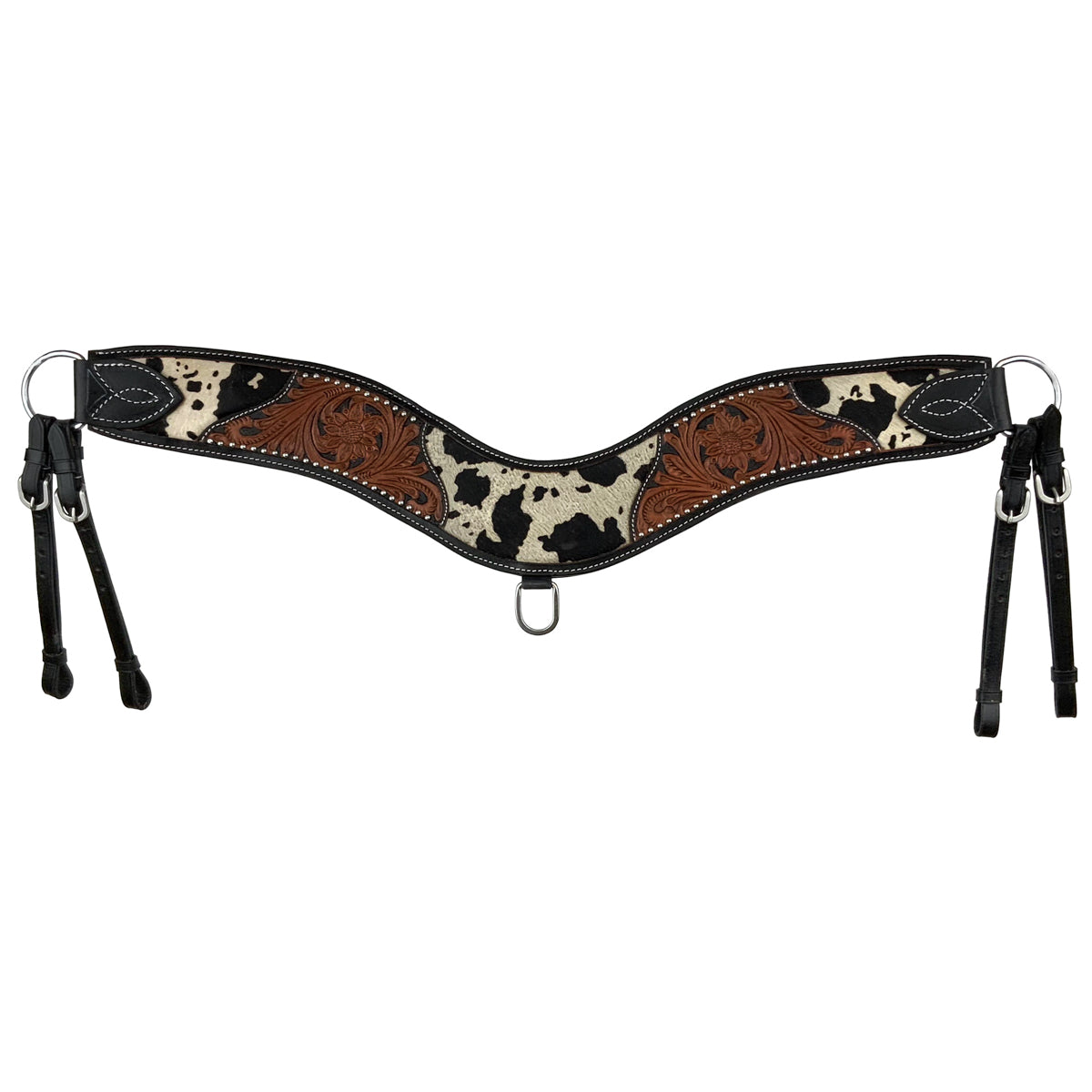 Showman® Tournsol Ranch Western Tripping Collar is made from premium leather and built to withstand the rigors of ranch life. The high-quality leather is not only durable, but soft and supple for the comfort of your horse. Exquisite sunflower tooling adds a touch of natural beauty and Western flair, while silver studs make perfect complements to the rich cowhide.