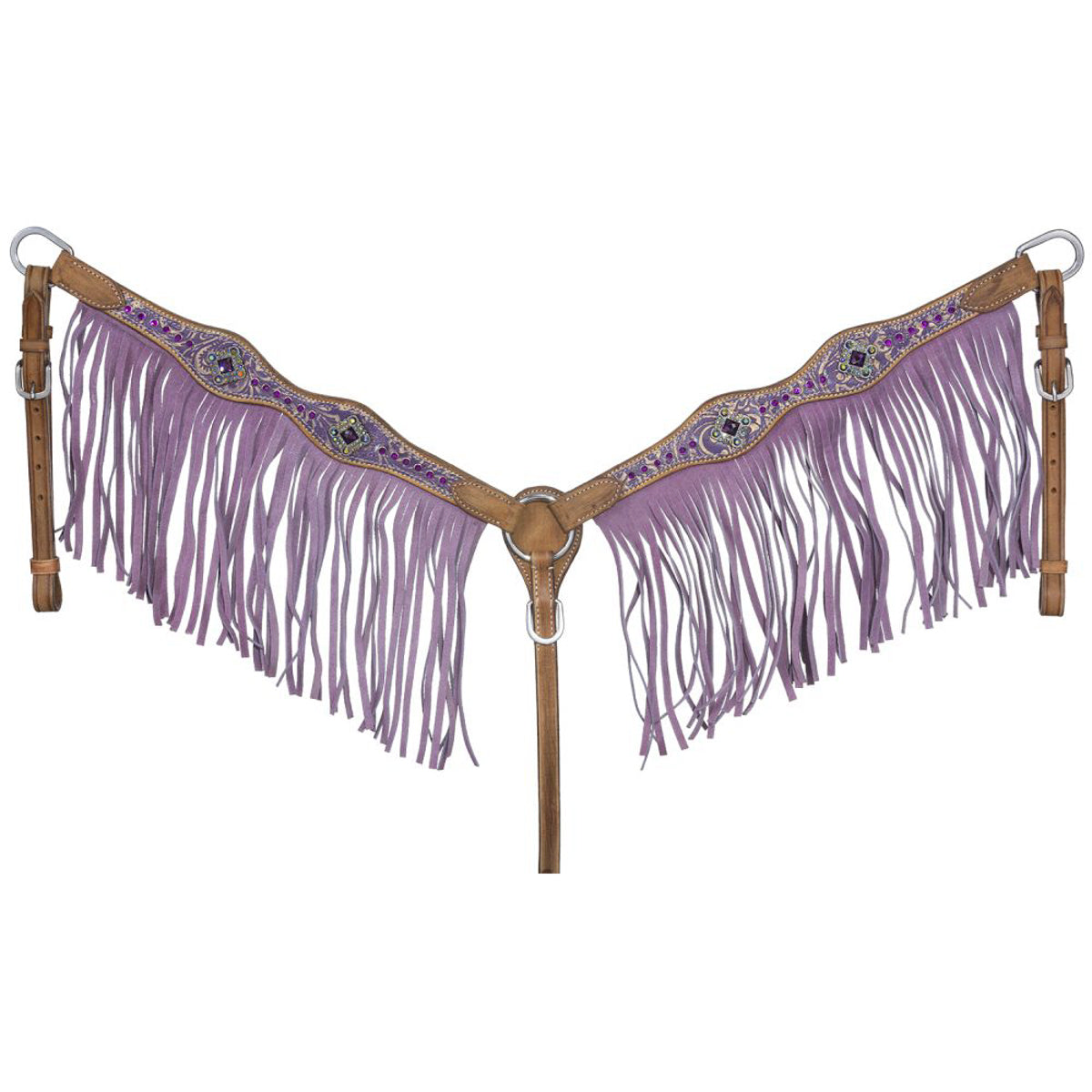 - Complete with purple suede fringe and adjustable tug straps.