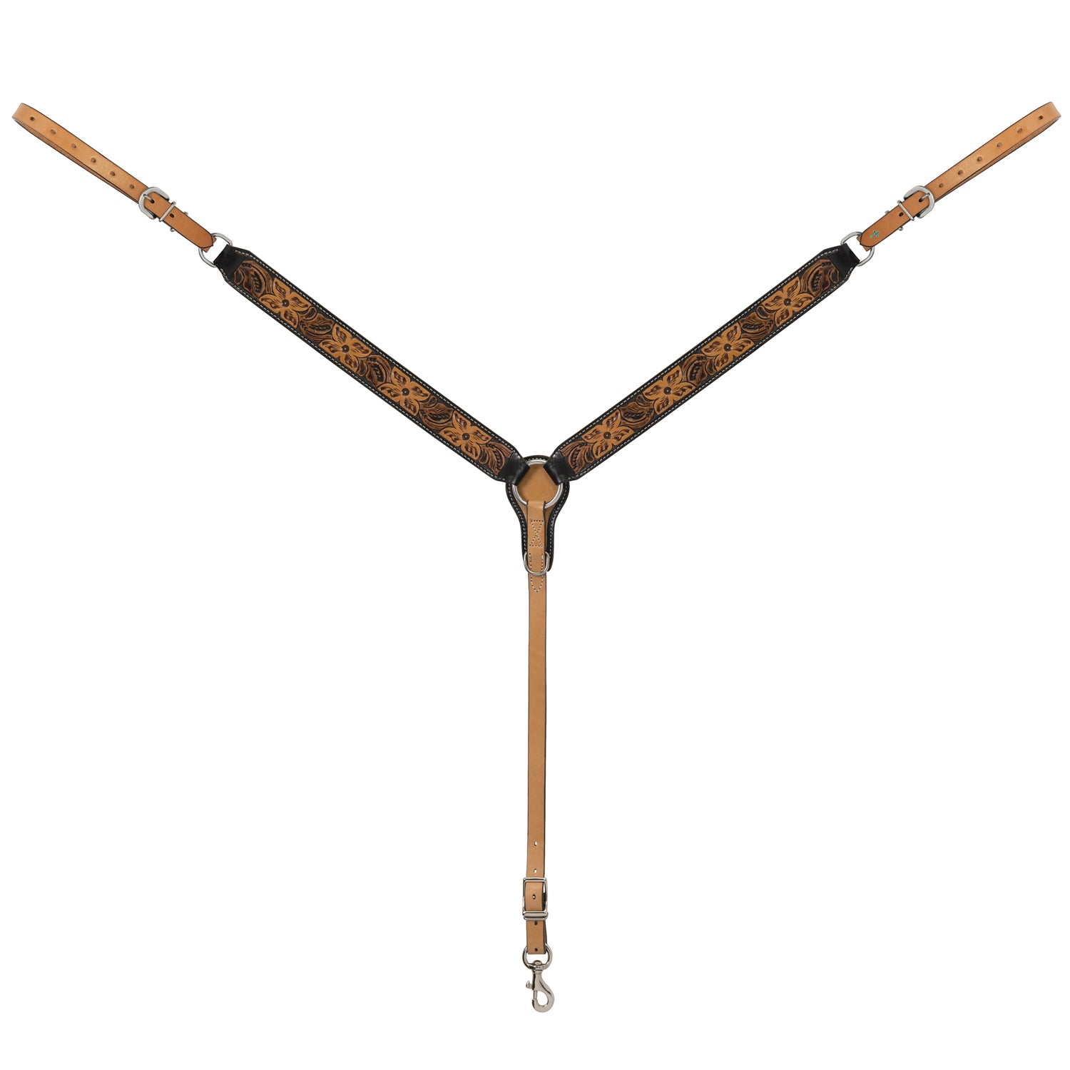 - Light-oiled leather horse breast collar adorned with beautiful floral tooling on the straight 1-3/4" breast pieces.