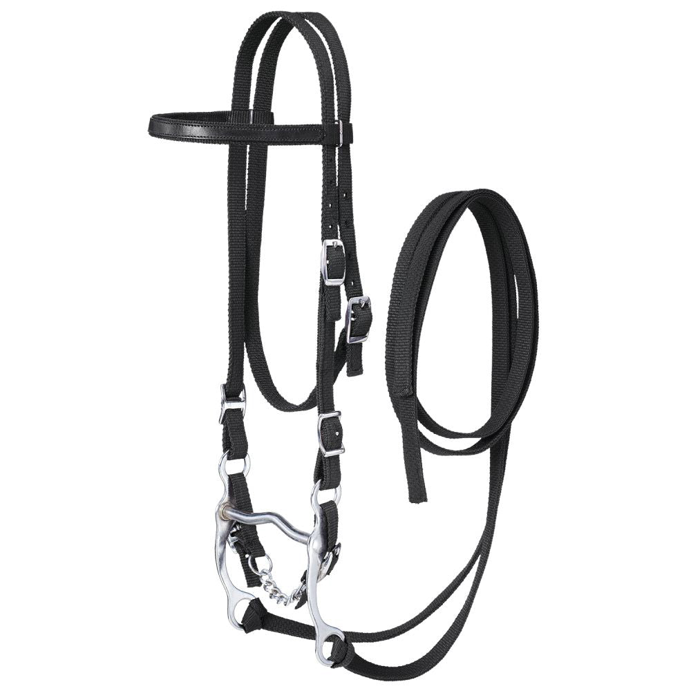 This King Series Nylon Browband Western Bridle arrives complete with a curb bit, curb chain and nylon split reins.