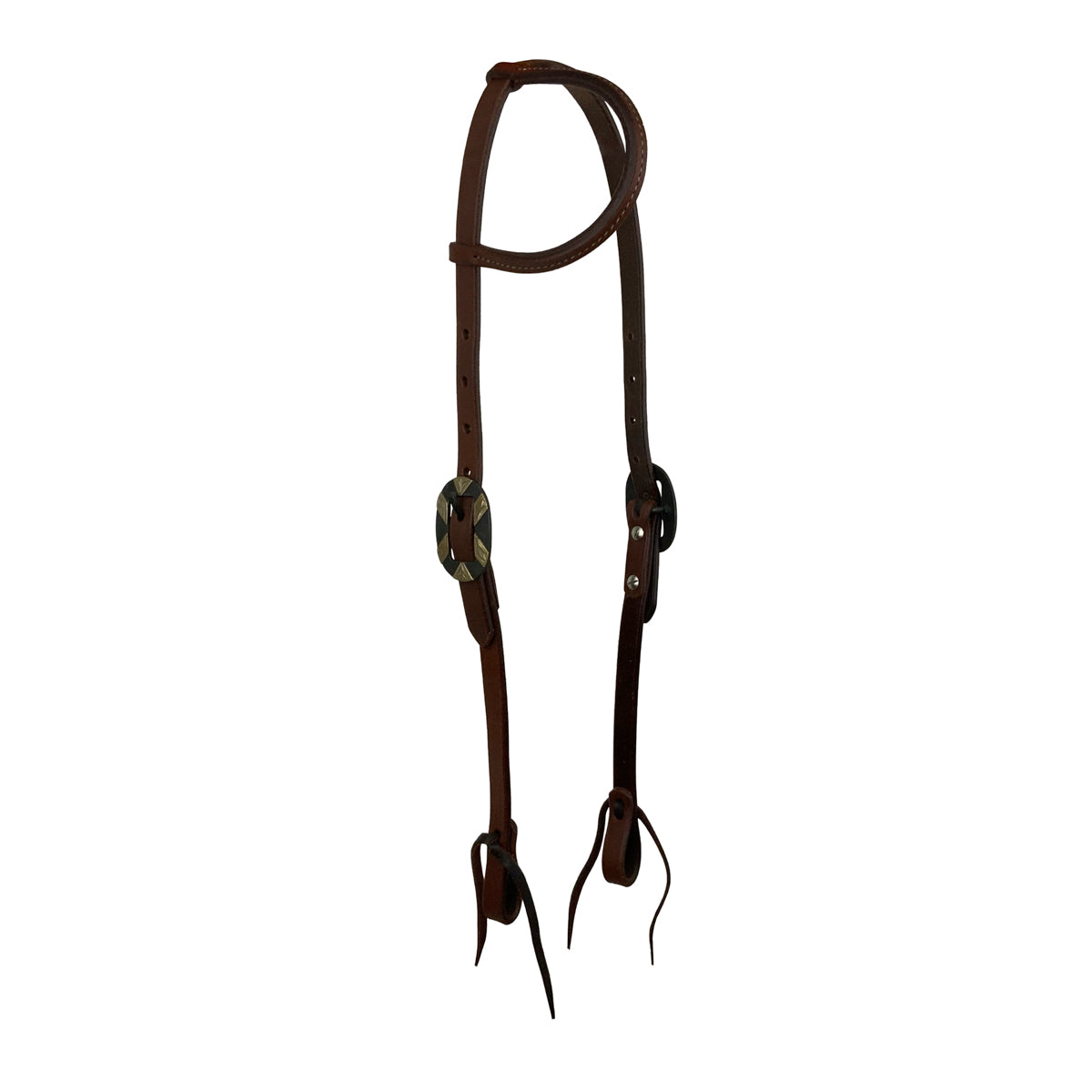 PRODUCT DESCRIPTION: Showman® Oiled Harness Leather Single Ear Headstall with Antique-Design Buckle