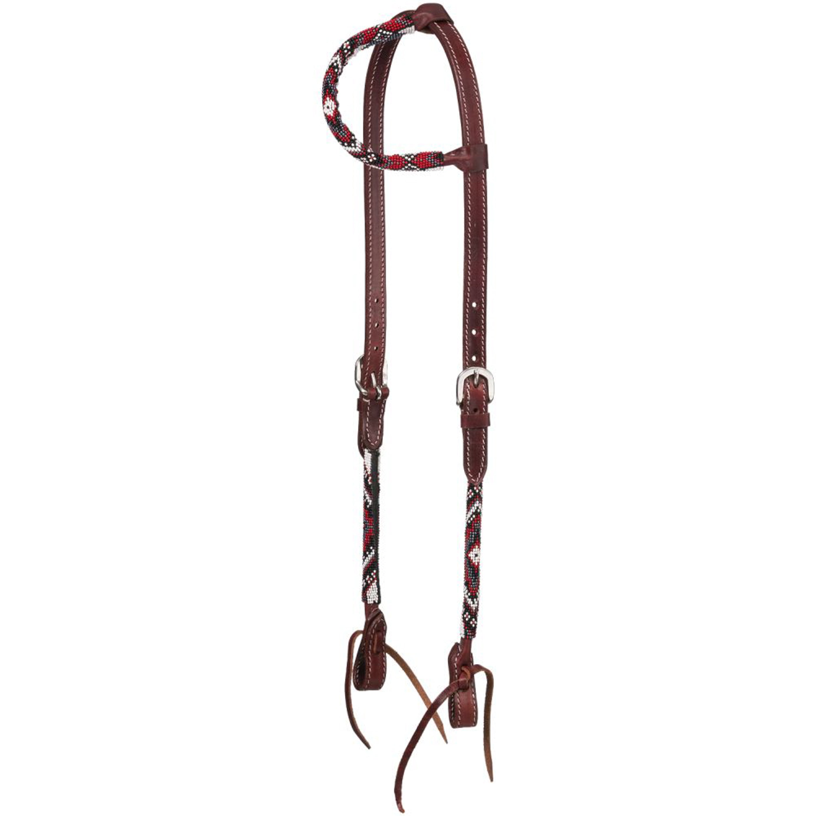 This Tough-1® Beaded Diamond One Ear Headstall is made of supple latigo leather. Hand-beaded custom diamond designs wrap the cheeks and ear.