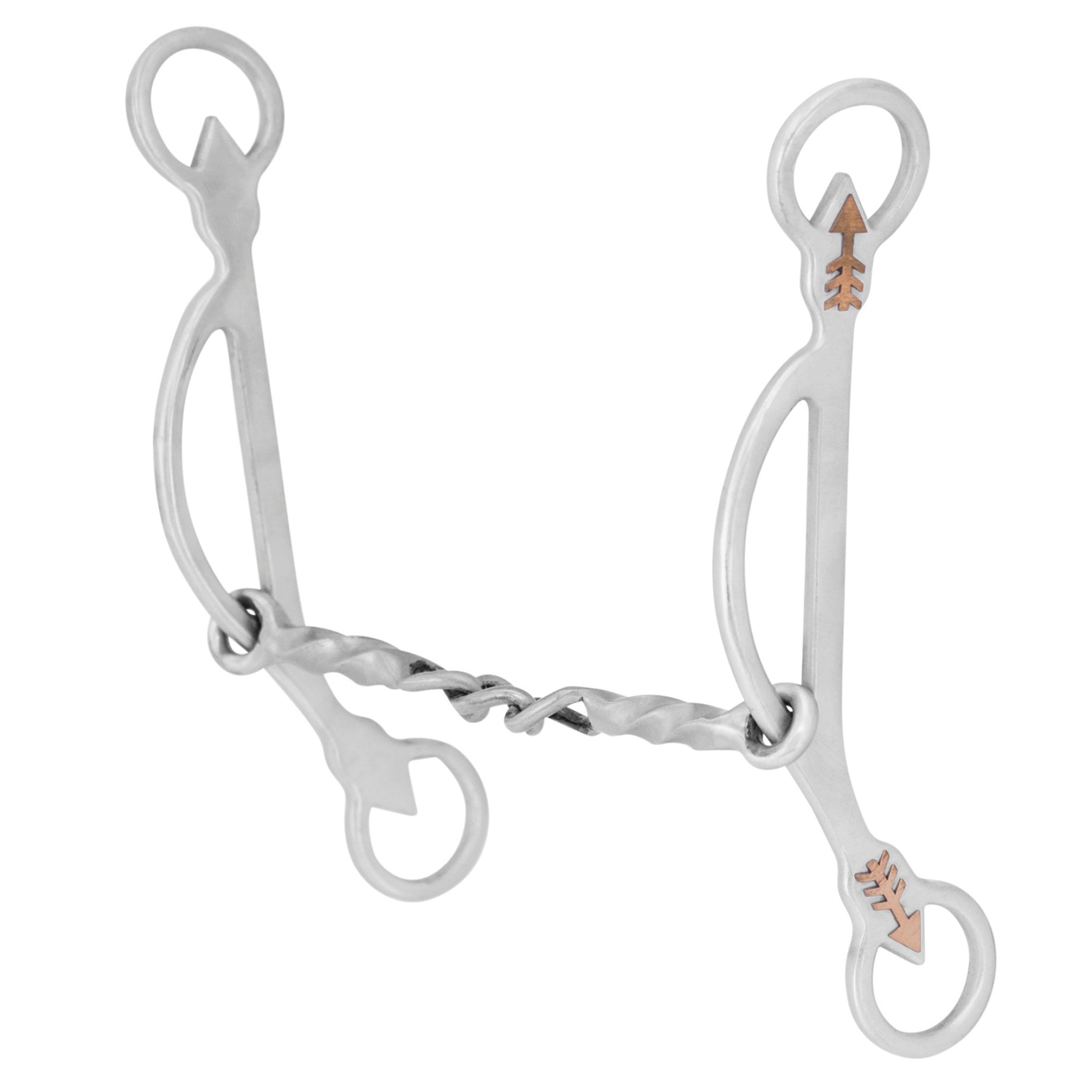 The Metalab Emilie Veillette Winner Twist & Chain Combo Gag is a Level Four bit in brushed stainless steel. It has a 5 1/8" sweet iron twisted mouthpiece with three center chain links and 7 1/2" cheeks with copper arrow trim.
