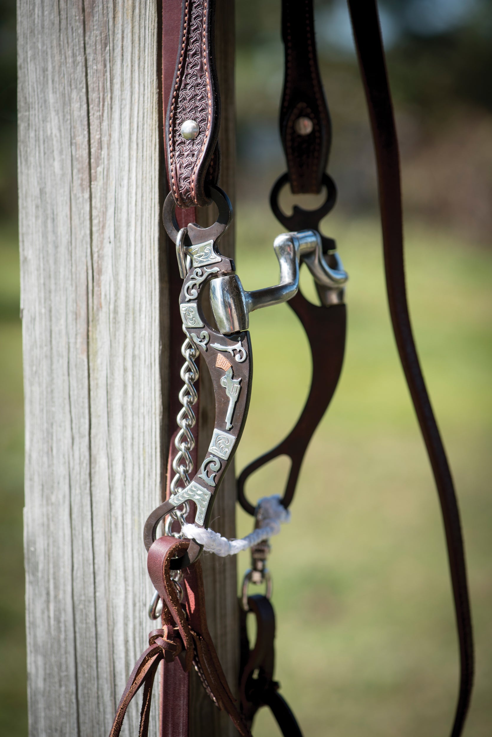 The Metalab Outlaw Transition Bit is a Level 2 design in raw steel with an antique finish. It features a 5 1/8" low hinged port, curved with copper inlays. The 7 1/2" medium shanks have engraved trims and a pistol motif, rope slobber bar and stainless steel curb chain.