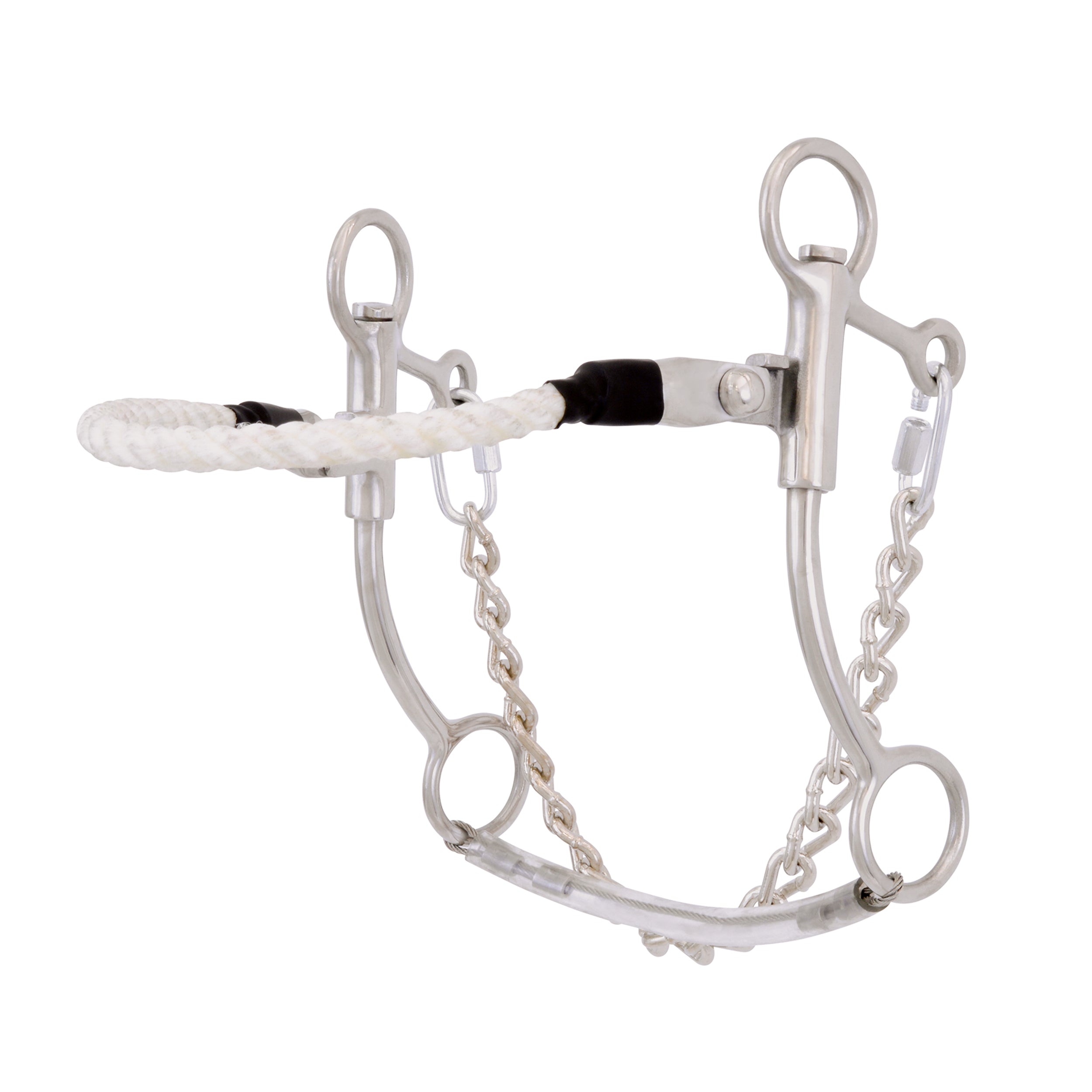 The Metalab Rope Noseband Hackamore is a Level Four and features stainless steel. Mouthpiece is a quick link chain with covered cable slobber bar. 7" medium shanks with swivel cheeks.