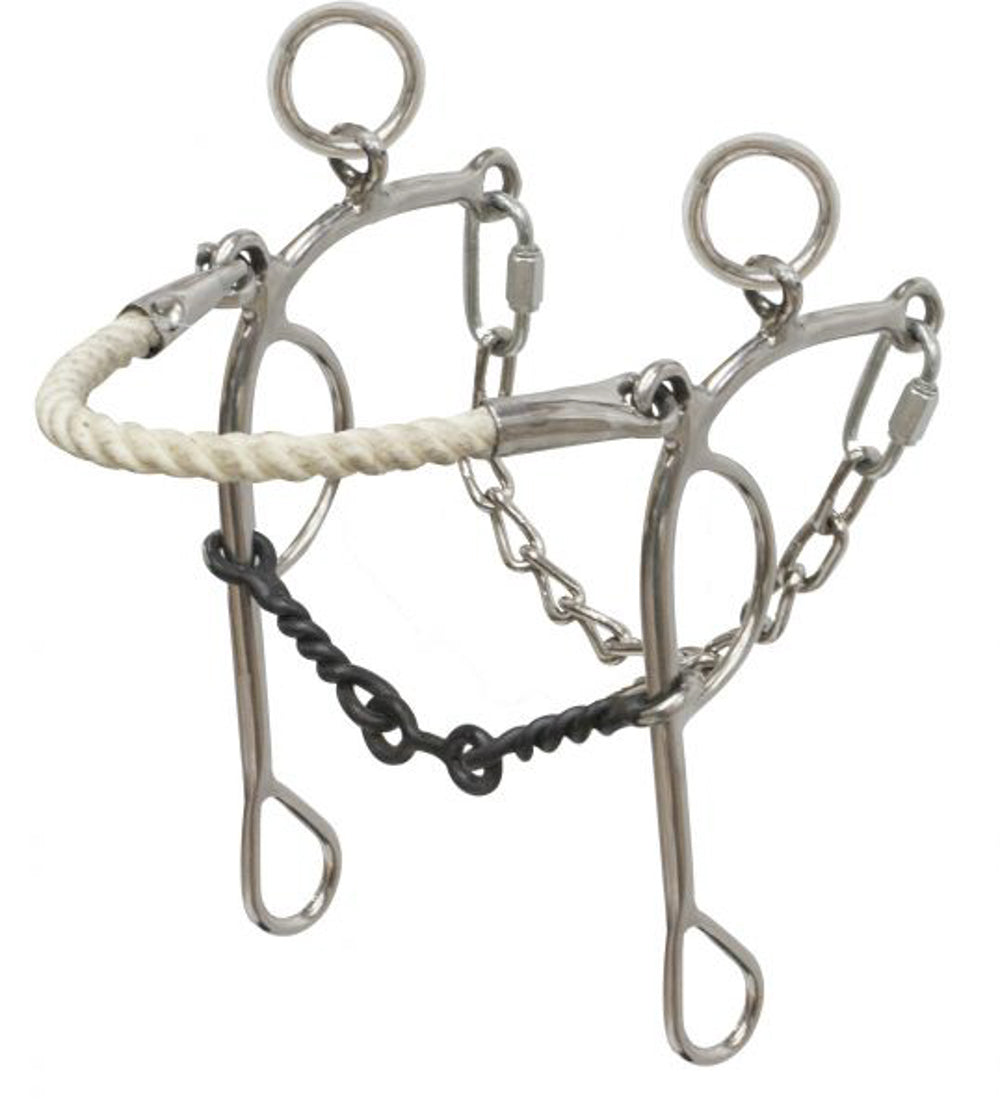 Showman® Stainless Steel Dog Bone Rope Nose Combo Hackamore/Gag features a 5" blued steel twisted mouth and 7" stainless steel cheeks.
